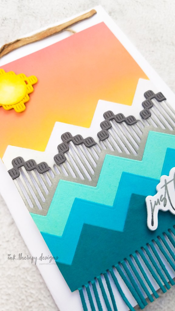 Scene elements. The rest of the card was simply die cutting, personalizing, and placing elements on the panel. I layered the sun with a small circle cut with the Hero Arts Infinity Circle die and a standalone die from the macrame diamonds set. I ink blended Catherine Pooler Tiara and Sauna dye inks on the edges for color. For the “triangles” on the mountain, I used one of the macrame diamonds dies and cut it in half horizontally (thank you for the suggestion @inkhillrevival!). I stacked two layers of “triangles” for dimension. For the mountain bases, I blended CP ink, Twilight, for added interest. The wood bar at the top is from the boho banner set and was colored with Copic markers.I glued some twine from my stash around the wood bar to mimic a hanging tapestry. The sentiment is from the hoop wreath stamp set. I made an ombre with Twilight and black ink to mimic the gradation of the sky and backed it with fun foam. I adhered everything with liquid glue and attached it to an A6 sized card base. I couldn’t bear to cut it down!