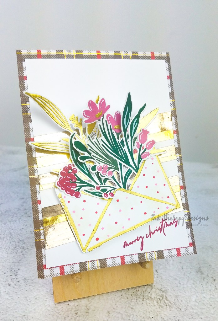 Envelope and flowers. I heat embossed and fussy cut the envelope. If I had the coordinating dies, it would have cut a slit for me to slide the florals into, but I used my craft knife instead. Although, it is mostly covered by the flowers, I lined the envelope with the same Memory Box Christmas plaid paper that I adhered to my card base. I stamped the floral elements with a variety of Catherine Pooler dye inks and added white gel pen detail for a finishing touch. I also gold heat embossed on greenery stamp from the Signed & Sealed with a Kiss to tie in the gold background. After arranging and gluing my floral arrangement, I backed the whole envelope with fun foam for dimension. Lastly, I added polka dots with two Copic Markers that closely matched the floral colors for an additional pattern. If you recall the tips on pattern play from my previous blog post, the stripes serve as my large pattern, the plaid as my medium pattern, and the dots as my small pattern, making the design cohesive and well proportioned.