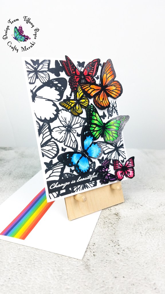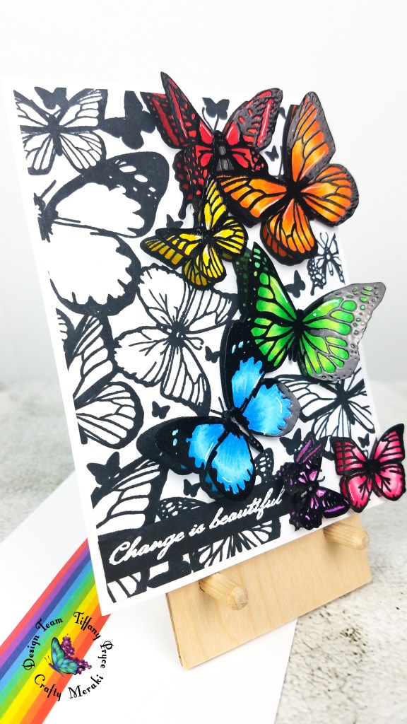 On another piece of heavyweight, white cardstock, I stamped the background 2 more times with copic marker-friendly, black ink. I only inked the right side of the stamp making sure my paper was large enough to stamp the entire butterfly image. I colored the same seven butterflies along the right side of the panel in the same way as the first panel. I left my stamp in place in my stamp positioning tool because after coloring, I heat embossed the butterflies in black. Lastly, I fussy cut the seven butterflies out and placed them in the correct spot on top of my panel with foam tape. Most butterflies were adhered with a single layer of foam tape, and one was adhered with a double layer for extra interest and dimension. I slightly folded each butterfly’s wings to reveal the color and sparkle underneath.