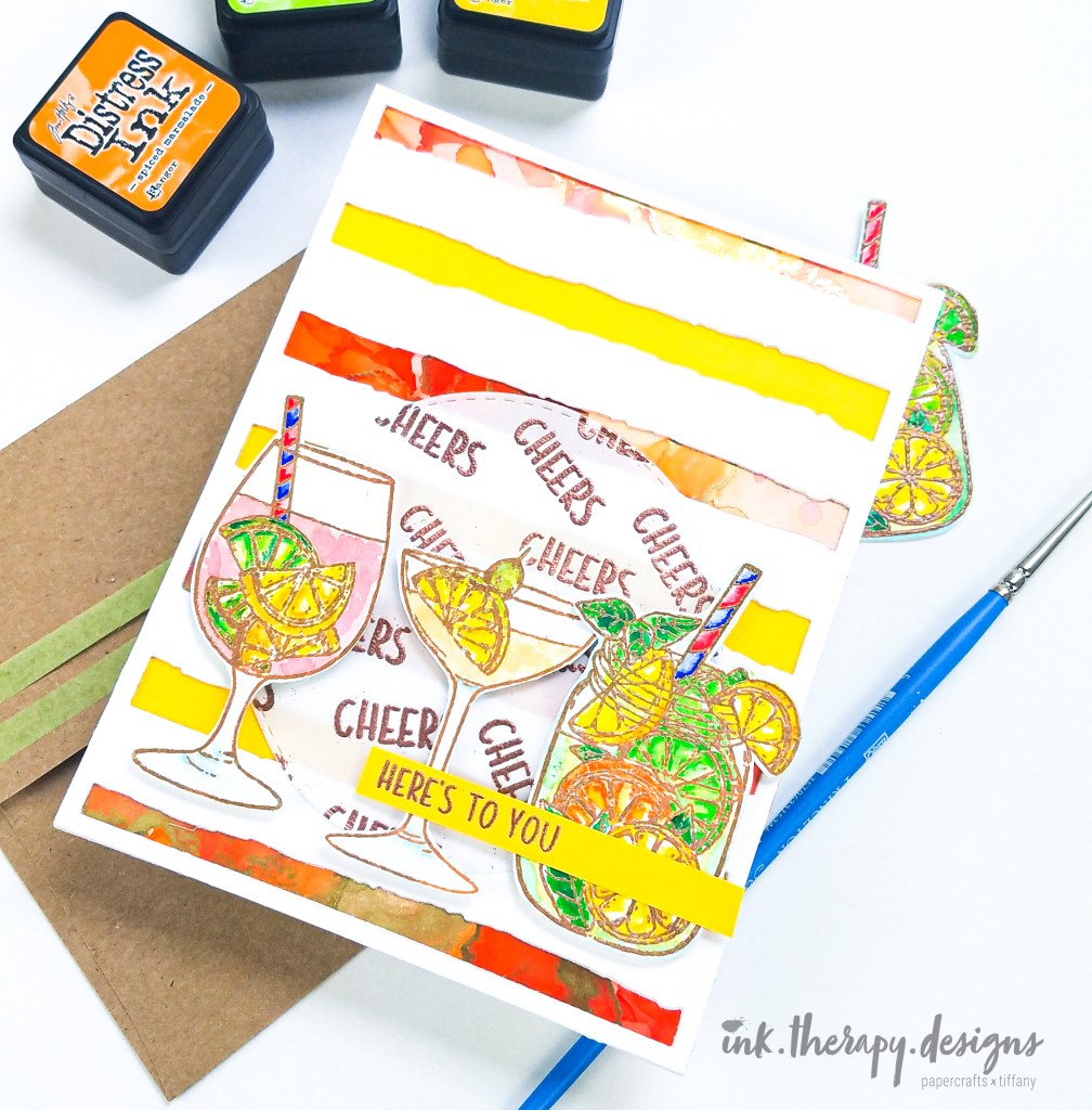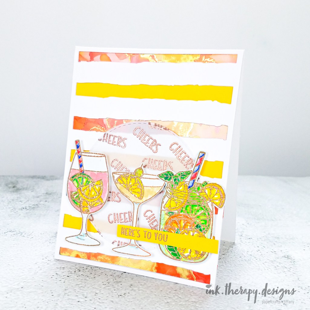 For my second card, I stamped, heat embossed, and watercolored three images in a similar way as my first card. After the images were dry, I fussy cut them and set them aside. Next, I worked on my background. I used the Honeybee Stamps, Watercolor Lines Cover Plate and die cut it three times. Behind the die cuts, I alternated scraps of yellow cardstock and an alcohol ink background I made. I love how the colors in the alcohol ink pick up the citrus colors in the drinks.