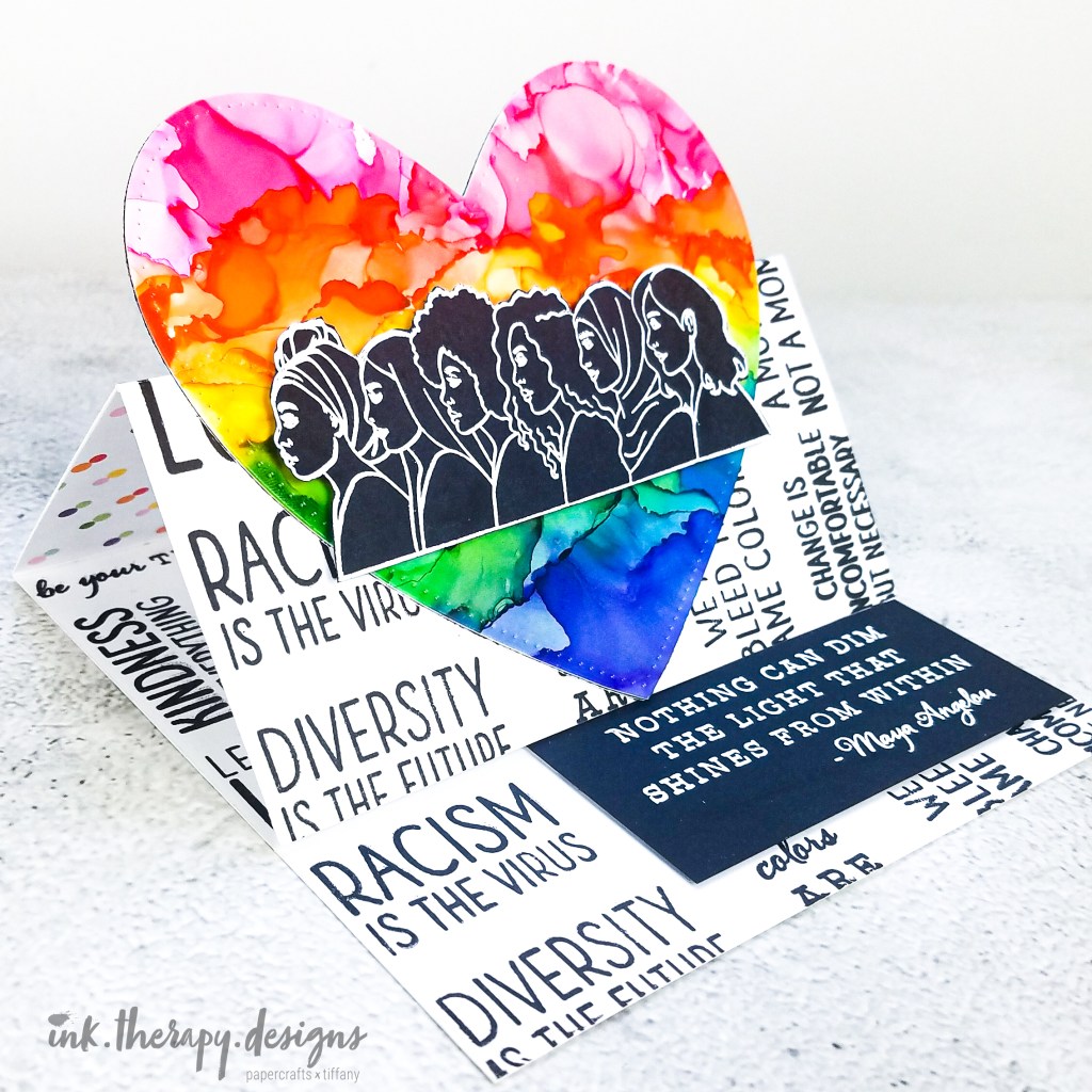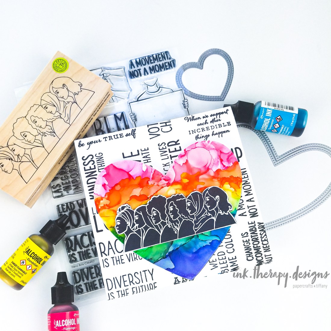 Focal image and sentiment. I decided to white heat emboss Hero Arts, American Women on black cardstock. After heat embossing, I fussy cut the image. I adhered the image on top of the alcohol ink heart with foam tape for dimension. On the inside of the card, I adhered a sentiment with thin foam tape to act as my stopper. The sentiment is from the Hero Arts, Empowerment stamp set and again, I white heat embossed it on black cardstock. And that’s all there was to it! I hope to send this to a friend to remind her that she is beautiful and to never let anyone make her feel less than enough.