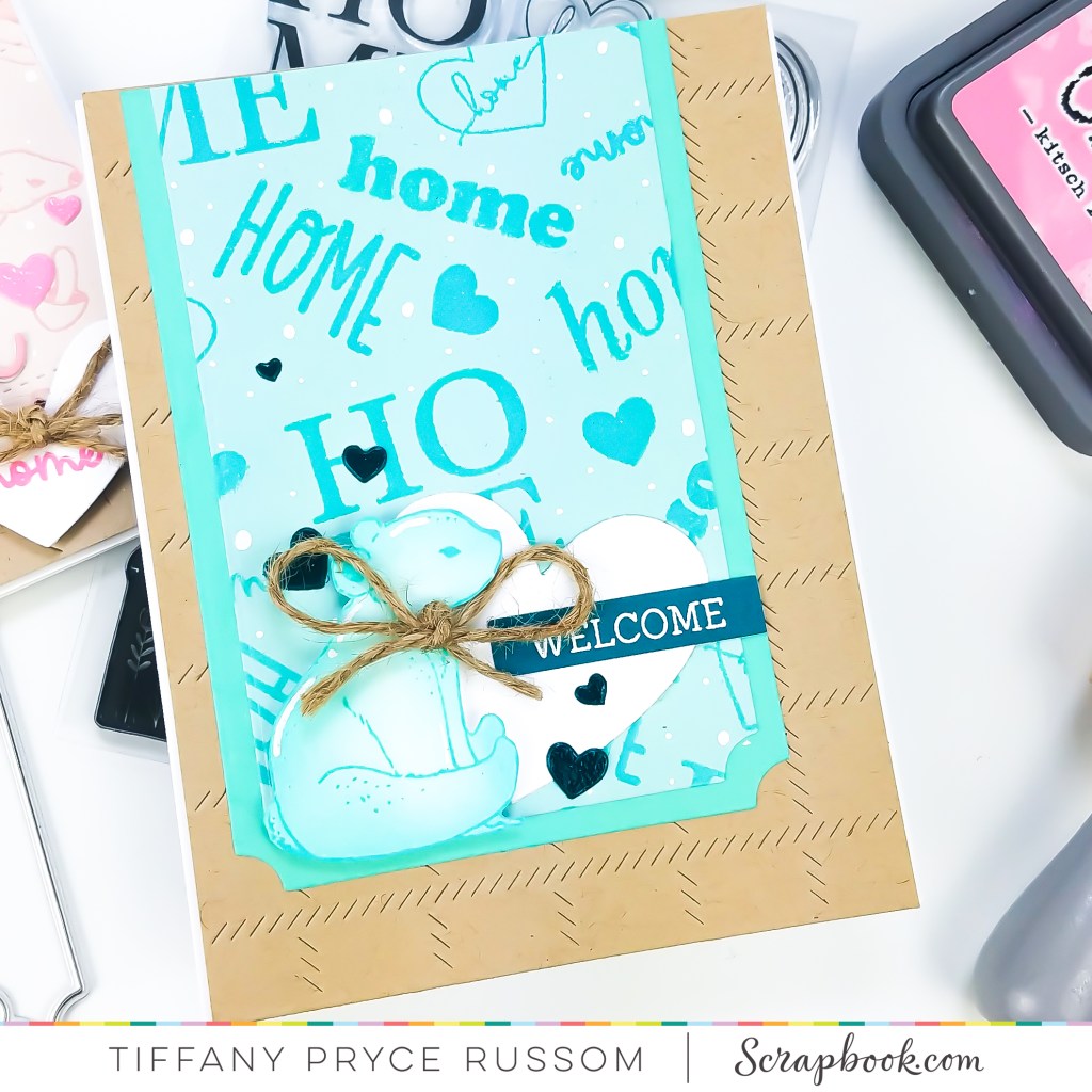Instead of making a pattern with spring animals, I used the Home stamp set in salvaged patina and clear heat embossed. Some sentiments, I masked off so I only stamped the word ‘home’ in several ways. I stamped the bear from the Spring Animals set, clear heat embossed it, and fussy cut it. To color the bear, I lightly blended some salvaged patina over certain areas and added highlights with my white paint pen.