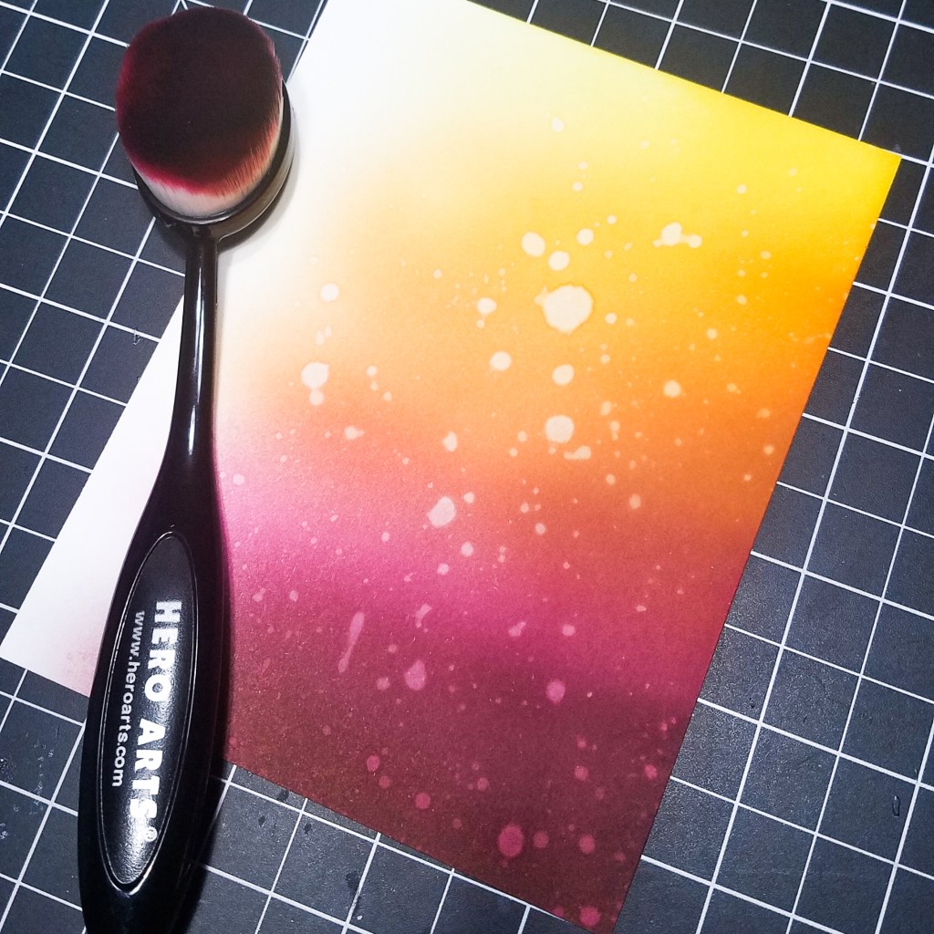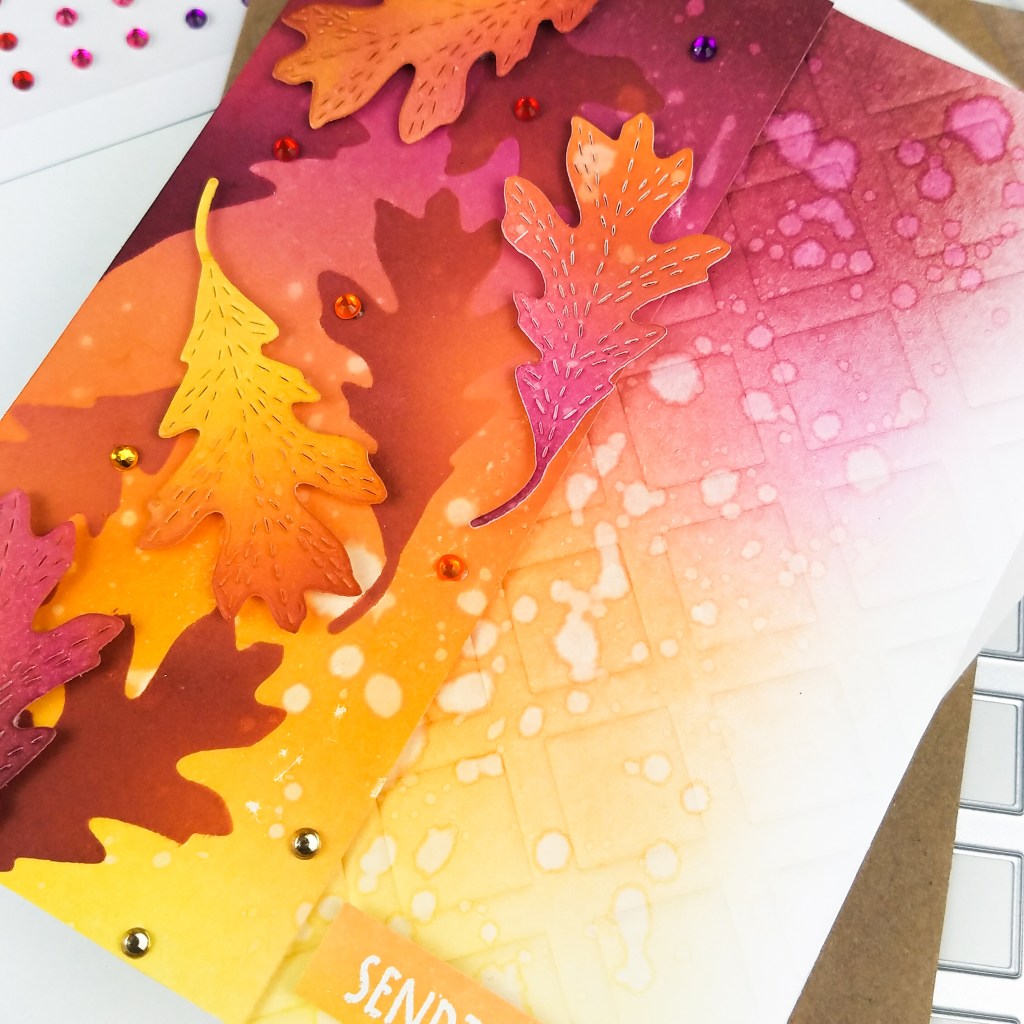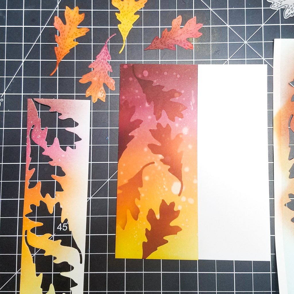 To start, I ink blended two panels with a variety of autumn inspired dye inks from Catherine Pooler – merlot, sparkling berry, clay mask, orange peel, shea butter. I blended one of the two panels a little lighter than the other. Since the inks are water reactive, I splattered both panels with water for a little texture. One panel was used as the background, and the other was used for my leaf silhouettes and die cuts.