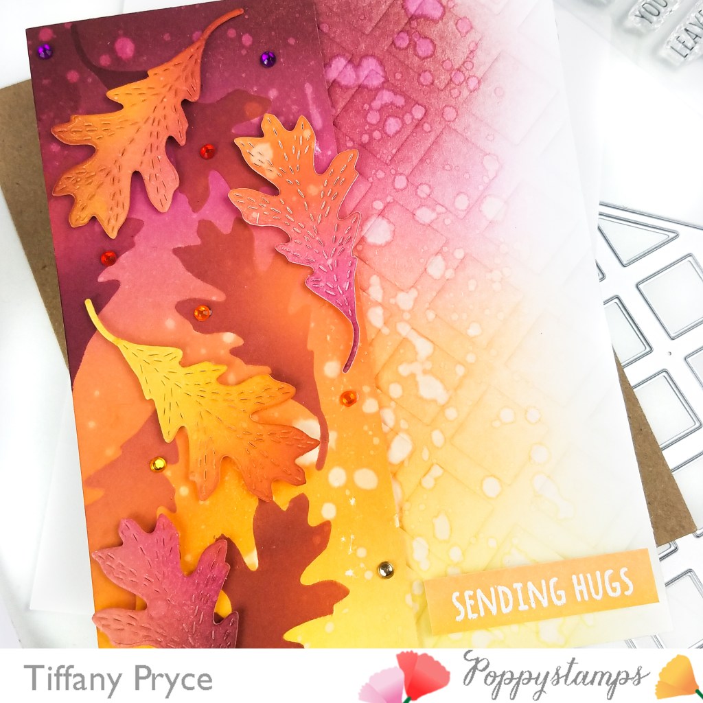 I tried a new (to me) technique with my Poppystamps products where made a stencil with one of the Whittle dies. I was inspired to try this from a Catherine Pooler video I watched. I covered a piece of scrap paper with masking tape and die cut the Whittle Oak Leaf multiple times to create a pseudo stencil. With the DIY stencil, I blended the same ink colors randomly on half of one ink blended panel, and then trimmed the panel in half. From the trimmed half of the panel, I die cut several leaves as normal. I added additional ink on the die cuts to deepen the colors.