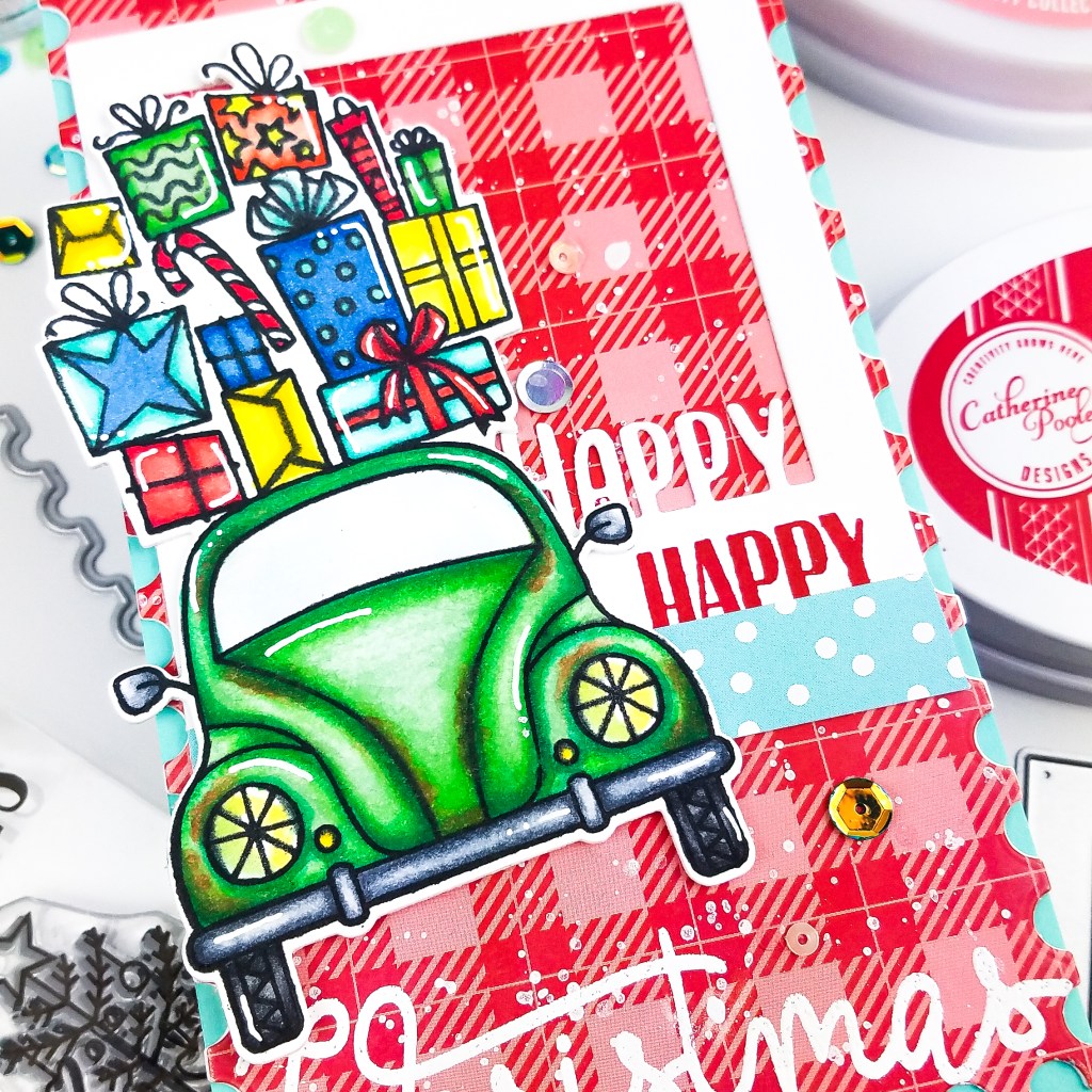 I added the adorable buggy and gifts that I copic colored on top. I love adding little details to my copic coloring and decided to add a little rust to my bug. I think it adds a little rustic charm. for the final detail, I added several sequins from the Wintergreen Sequins mix.