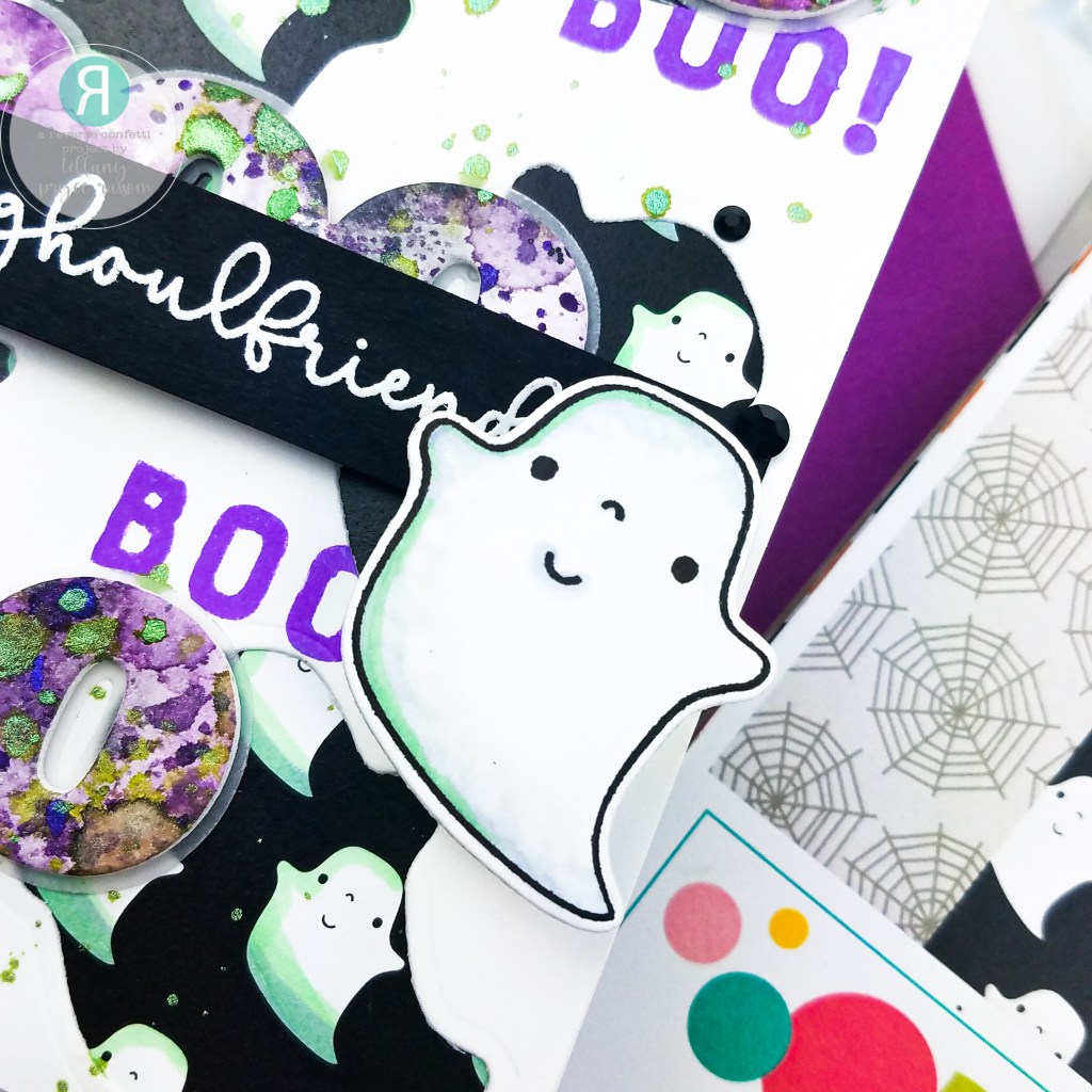 Sentiment and final touches. For the sentiment, I used the Layered Boo Confetti Cuts. I started by ink smooshing and spraying a piece of watercolor paper with distress oxides and mica spray in Bubbling Cauldron, Hocus Pocus, and Empty Tomb. I smooshed and dried several layers until I was happy. Once the panel was dry, I die cut it with the top layer of the Boo die. The shadow layer was cut from vellum. I heat embossed the sub sentiment in white on black cardstock. I glued the ends of the sub sentiment down and added volume to the center to make it look like a banner. I added a ghost that I stamped and colored from a previous card on a mini action wobbler for an interactive element on my card. Head over to my IG to see a short video of the ghost waving hello. Lastly, I added some black jewels for some sparkle, and that’s it!