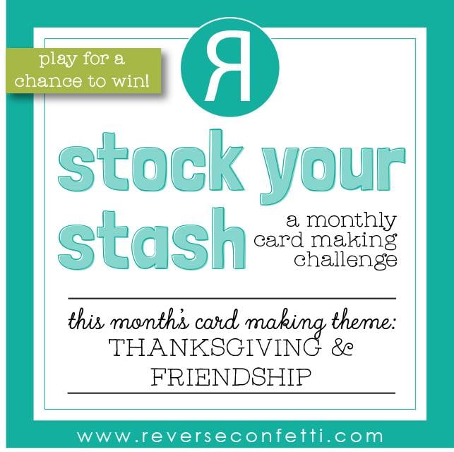 It’s time for a new Stock Your Stash challenge! And this month, Reverse Confetti is celebrating all things Thanksgiving and Friendship. How appropriate with the holiday season fast approaching. There is a new Stock Your Stash challenge posted on the Reverse Confetti blog on the 1st of each month. Enter your design between the 1 to 29th of the month on the Reverse Confetti blog. All you have to do is create a card or some other craft with your RC stash! You can enter as many times as you wish. At the end of the month a random winner is chose to win a $20 gift certificate to the Reverse Confetti store. Don’t forget to tag RC and use #SYSChallenge on social media!