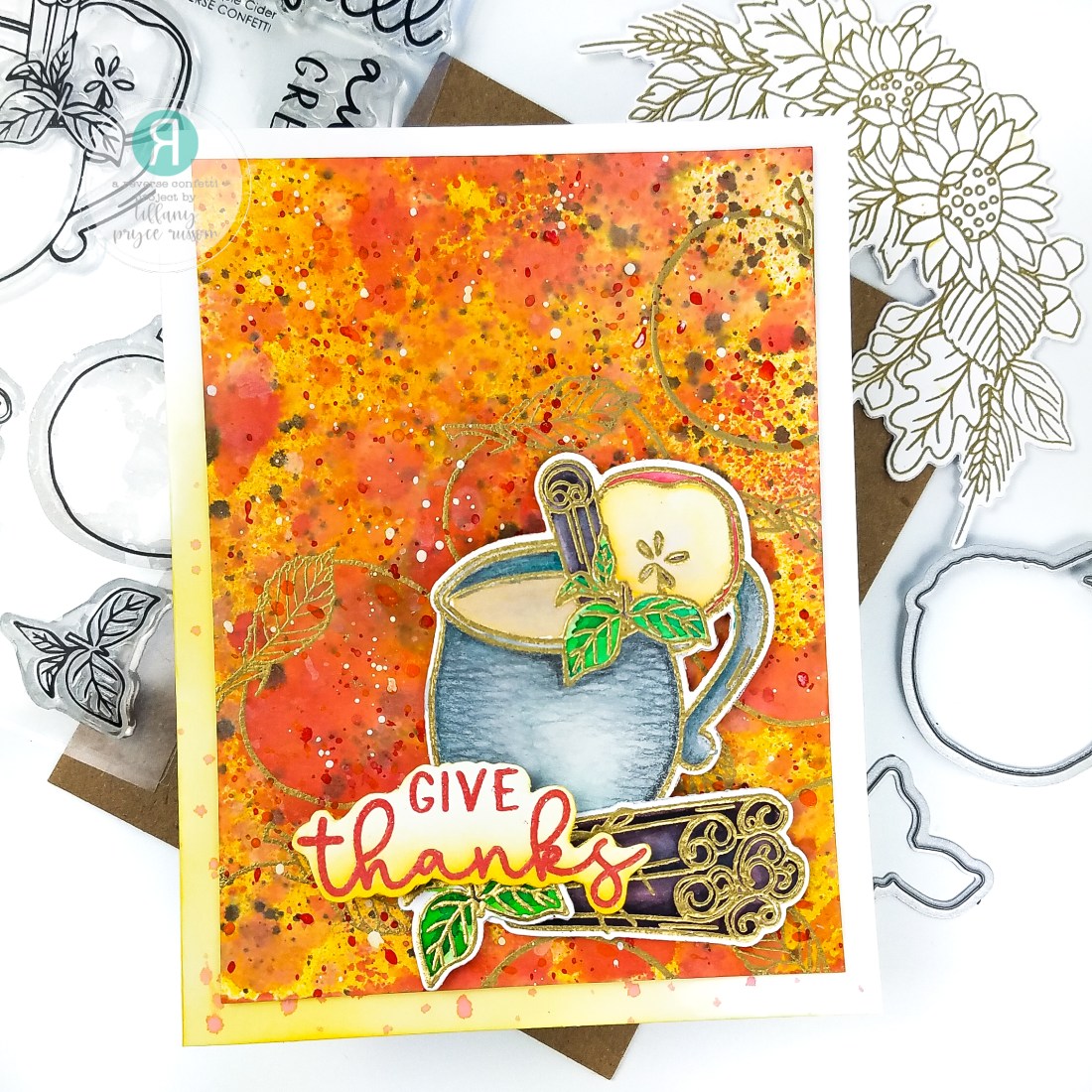 After inking and after the panel was completely dry, I gold heat embossed several apples using the Autumn Apple Cider stamp set. Next on a separate piece of watercolor paper, I gold heat embossed and watercolored a few images from the Autumn Apple Cider set. I used my Jane Davenport watercolor brush markers for some very simple coloring. After coloring, I die cut the images with the coordinating Confetti Cuts. The sentiment is from the Fall Flowers stamp set. I stamped it in Candied Apple distress oxide ink and clear heat embossed it. I fussy cut the sentiment and blended some yellow dye ink on the bottom for an ombre look. I arranged my images and adhered them with foam tape making sure that all of the images were level. On the card base, I lightly ink blended some yellow ink and splattered with orange watercolor just to tie in the mixed media look. And that’s it! A pretty simple card with a busy background. Hope you’re inspired to play along with us.