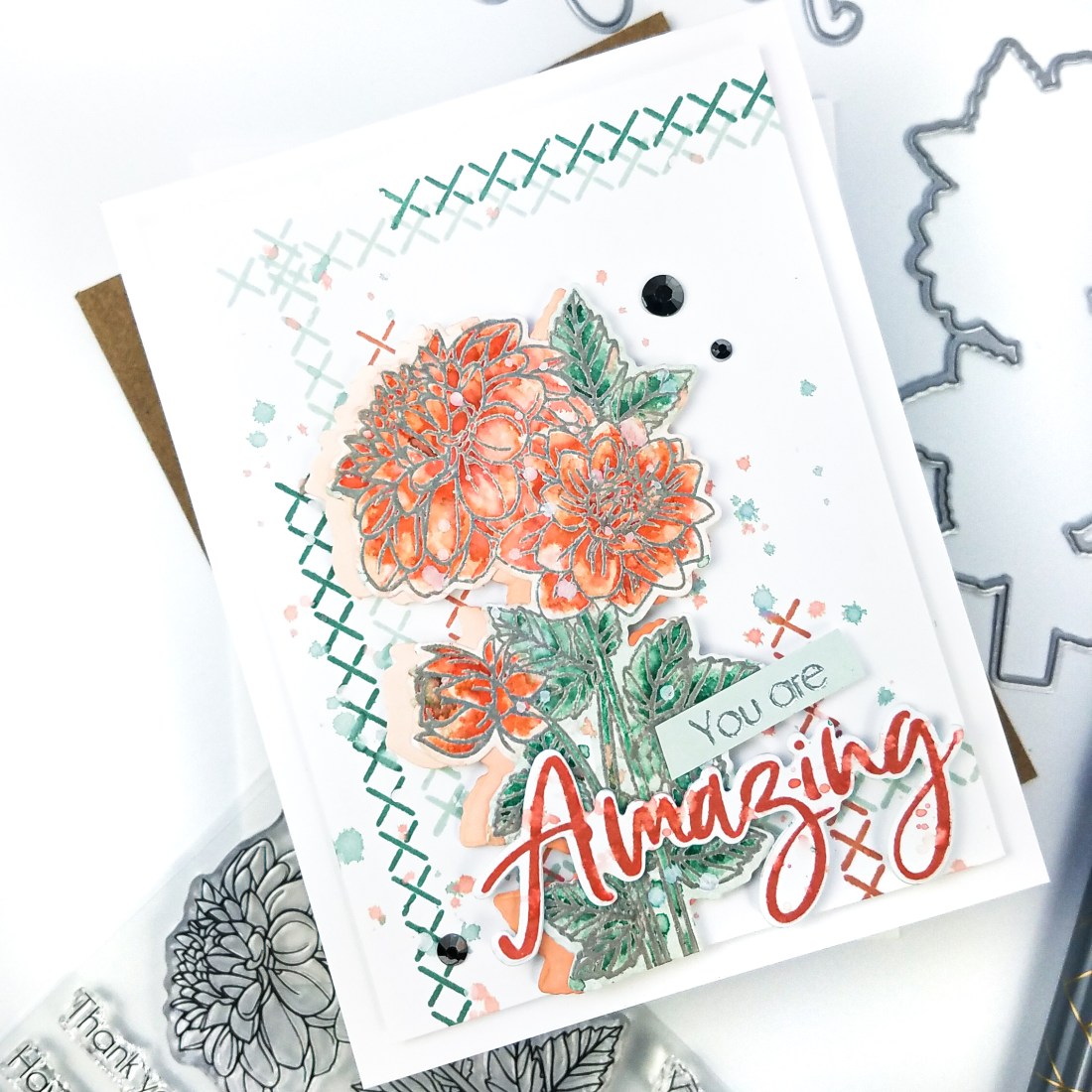Next, I worked on the focal, floral image. I stamped the image in gray pigment ink and heat embossed with clear embossing powder. Watercoloring a heat embossed image is my favorite way to watercolor. I used dye ink in my stash to watercolor the dahlia. I used multiple shades of Pigment Craft Co ink – a pink/orange color and a deeper orange color. For the leaves and stems, I used two shades of green dye ink. After I finished watercoloring, I splattered the image and the white panel with the same color inks, diluted, white acrylic paint, and clean water. After the flower was dry, I die cut it using the coordinating die. I also die cut another flower from white cardstock and ink blended it. I layered it behind the watercolored flower. I popped the flower up with foam tape and adhered it to the card front.