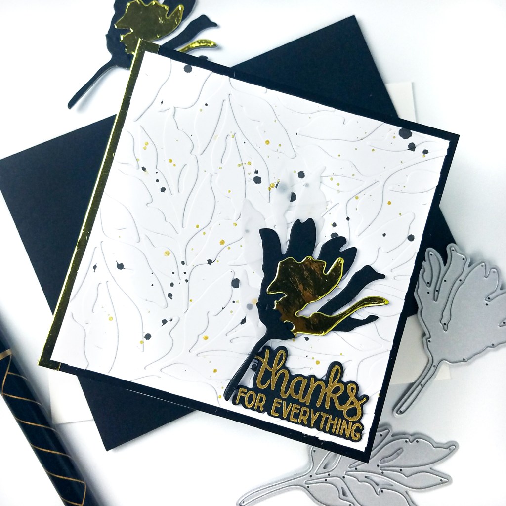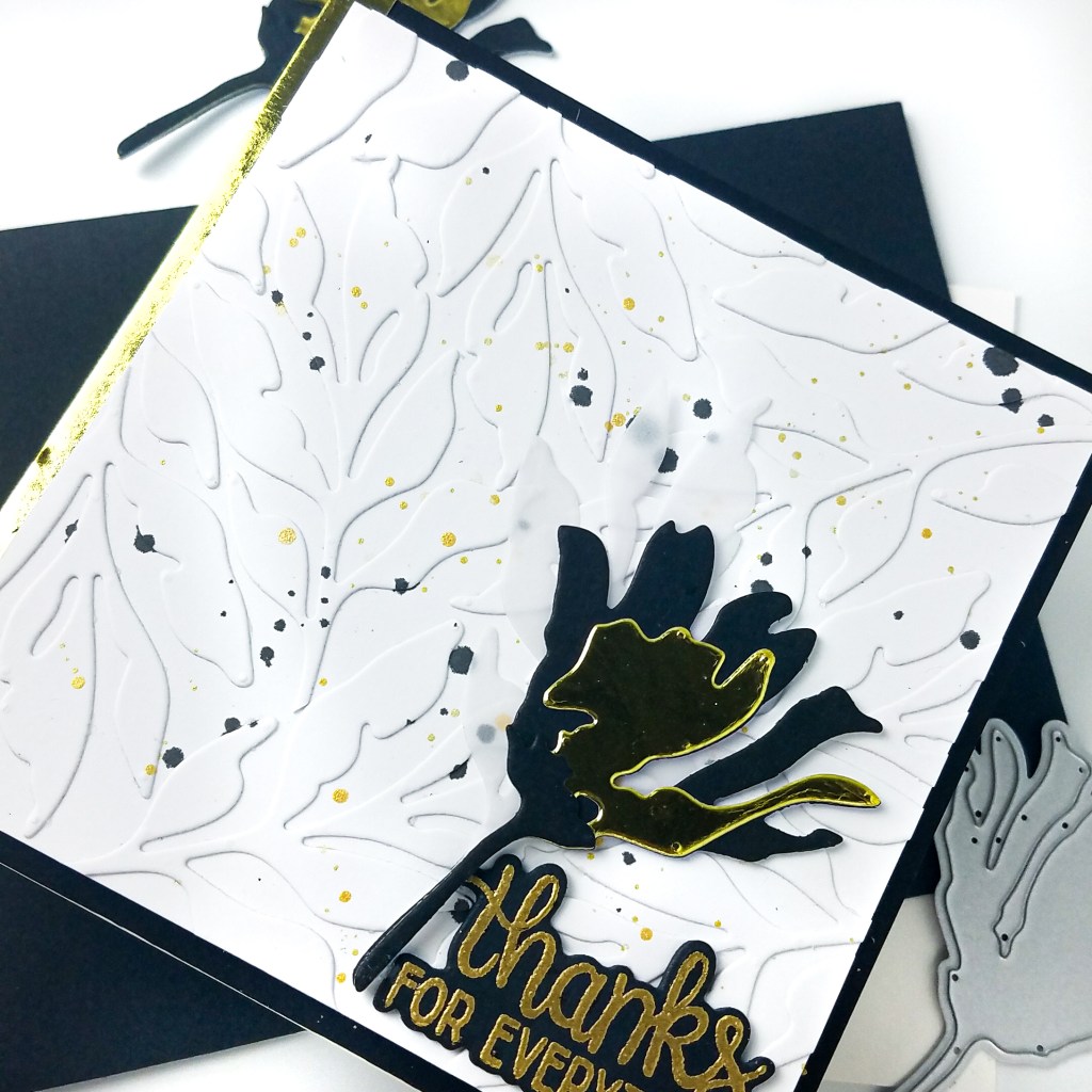 To start, I cut a 4 x 4 inch panel of white cardstock. Then, from white cardstock, I die cut several leaves from the Perfect Petals Layering Dies. After arranging all of my die cuts on the square panel, I lifted everything with a piece of Press ‘N Seal. I flipped the Press ‘N Seal over, added liquid glue on the leaves, and then adhered them in place on the panel. It is such an easy way to arrange and adhere die cuts in one fell swoop. I splattered a little black ink and gold watercolor on the panel. In the background, I cut a 4.25 x 4.25 inch panel of black cardstock. To the left side I added a thin strip of gold mirror paper for a little interest. I adhered these layers together on a white, square card base.