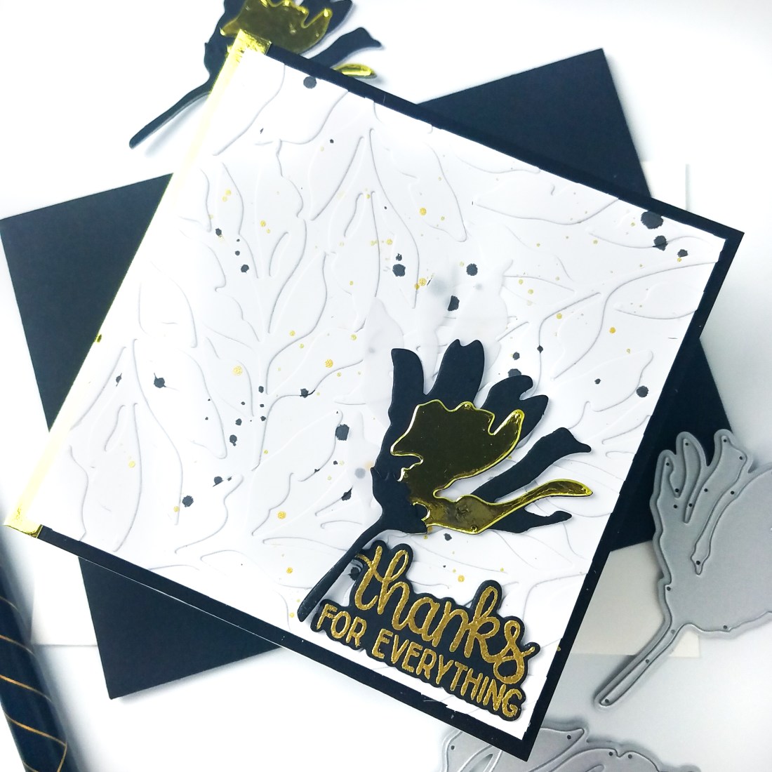 Next, I die cut the layers of the smaller flower from the Perfect Petals Layering Dies from black and gold cardstock. I also die cut another leaf from vellum. For the sentiment, I gold heat embossed a sentiment from the Thankful Flowers Slimline stamp set and die cut it with the coordinating die. Pro tip: Do you ever find stray embossing powder specks when heat embossing on black cardstock? No problem! Take a black fine liner pen and carefully color over the stray specks to clean up the lines of the sentiment. Until next time, thanks for reading and have a wonderful day!