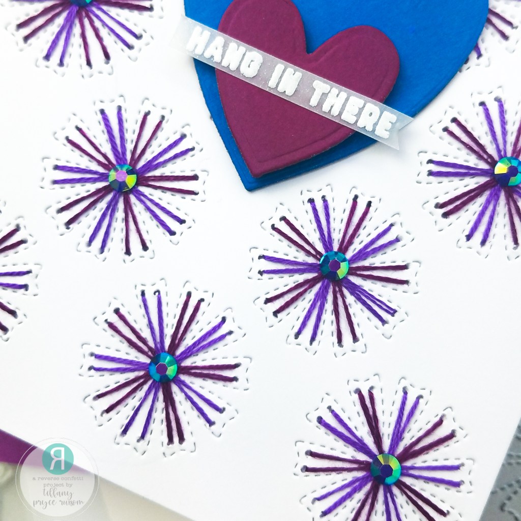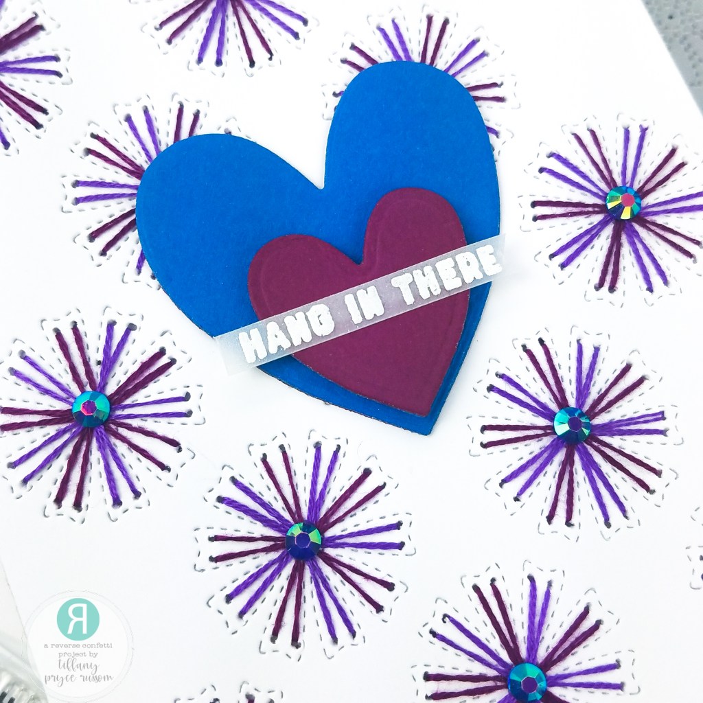 - Die cut two hearts from the Lovely Tag Confetti Cuts with blue and purple cardstock and adhere them together with foam tape.
