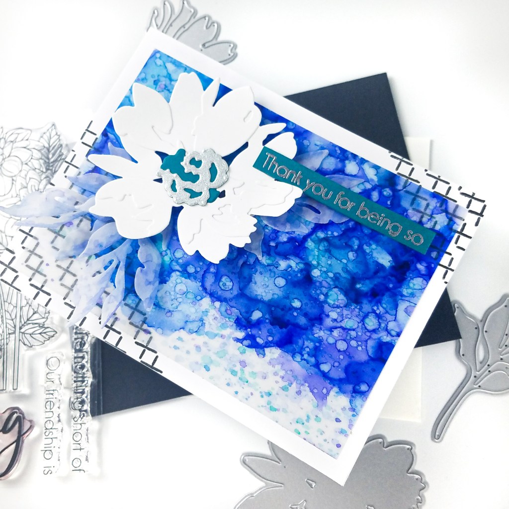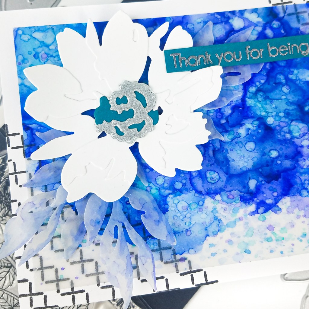 While my panel was drying, I die cut the large flower from the Perfect Petals Layering Dies set from white cardstock. I die cut the leaves from an extra piece of vellum that I splattered with blue alcohol ink. The flower center was die cut from teal and silver cardstock. I adhered the flower together, slightly curling the petals for dimension, and popped it up on the alcohol ink background. I heat embossed a sentiment from the Dahlia stamp set in silver embossing powder and adhered to the card front. Inside the card, I stamped ‘amazing’ in black ink so the full sentiment reads ‘Thank you for being so amazing’.