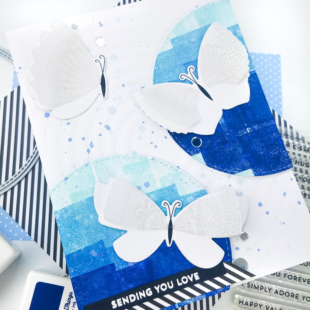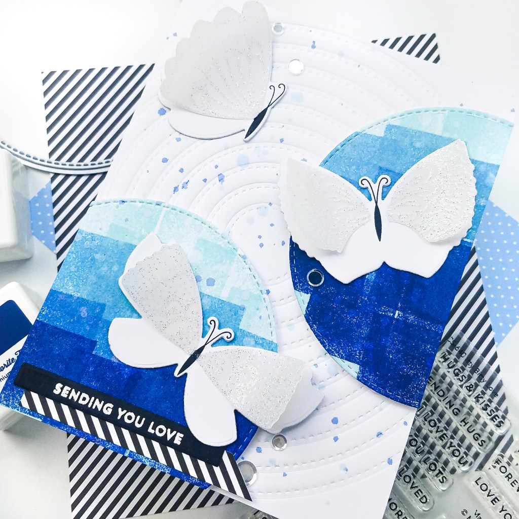 - Using the Brilliant Butterflies Die-namics, die cut three butterflies. Using the stamp set, stamp the butterfly bodies in MFT Extreme Black ink, and stamp the coordinating wings on vellum with embossing ink. Heat emboss the wings with sparkly embossing powder.