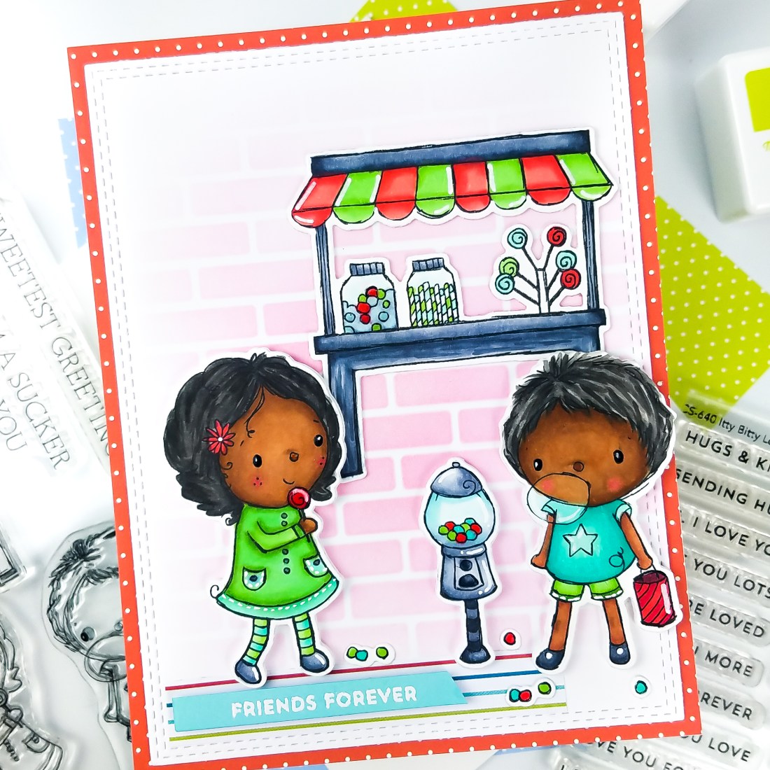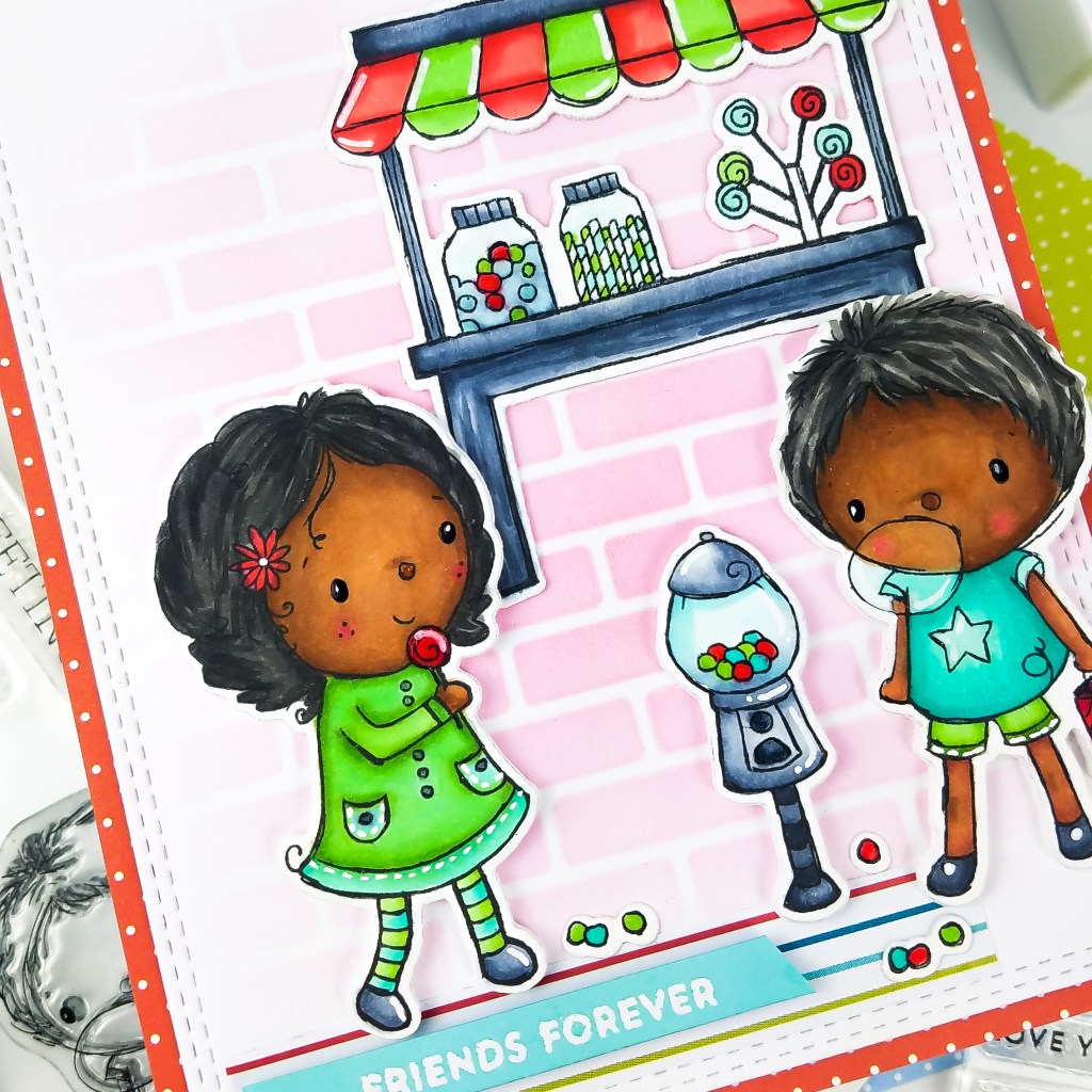Hi crafty friends! There’s a new color challenge up on the MFT blog and I love this color combo. Please head over to the MFT blog for all the details on eligibility and how to enter. To inspire you to play along, I made a fun card featuring the Rachelle Anne Miller Sweet Shop stamp set.