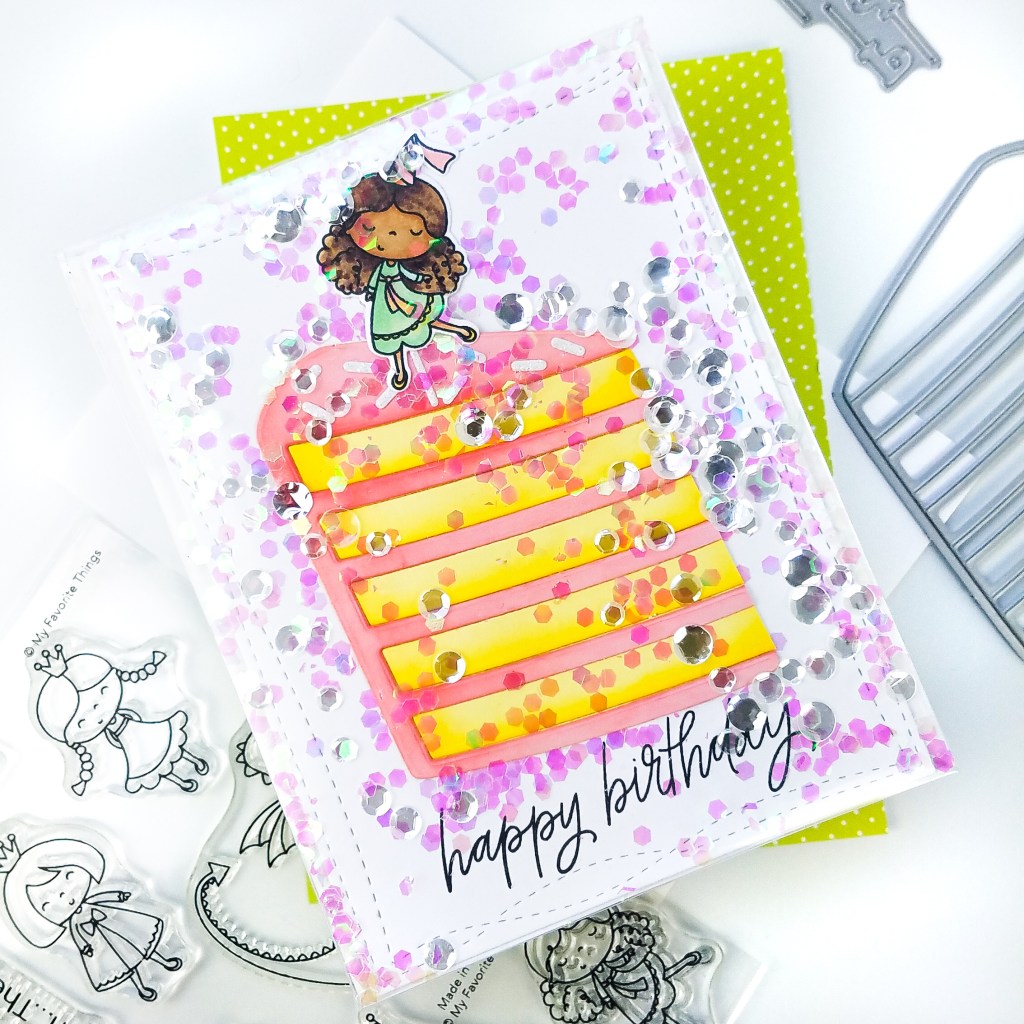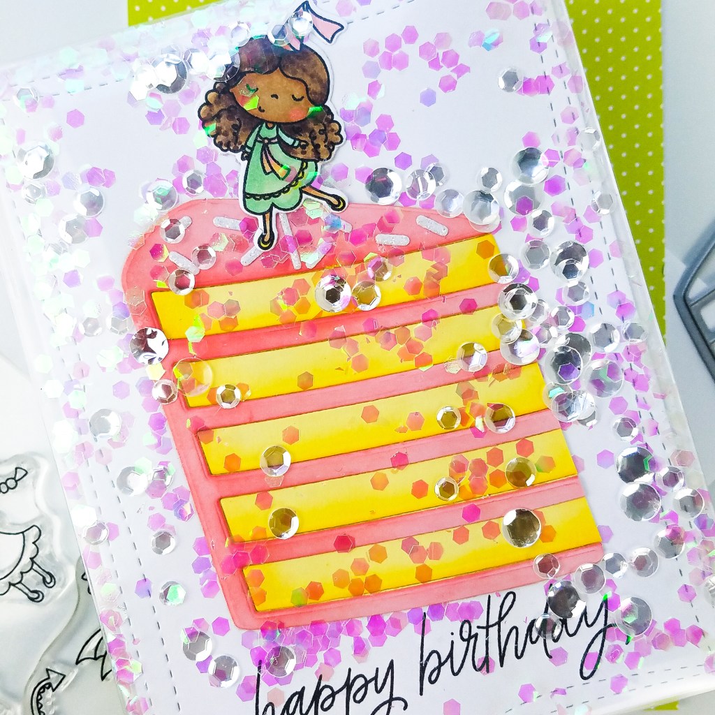 - Using the Happy Cake Day Die-namics, die cut the slice of cake from yellow and pink cardstock. Die cut the sprinkles and one letter from glitter cardstock.