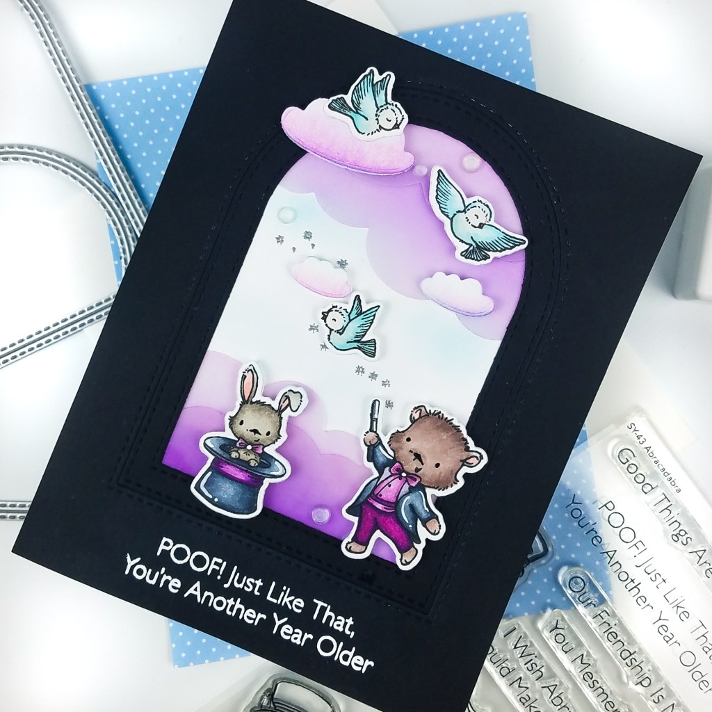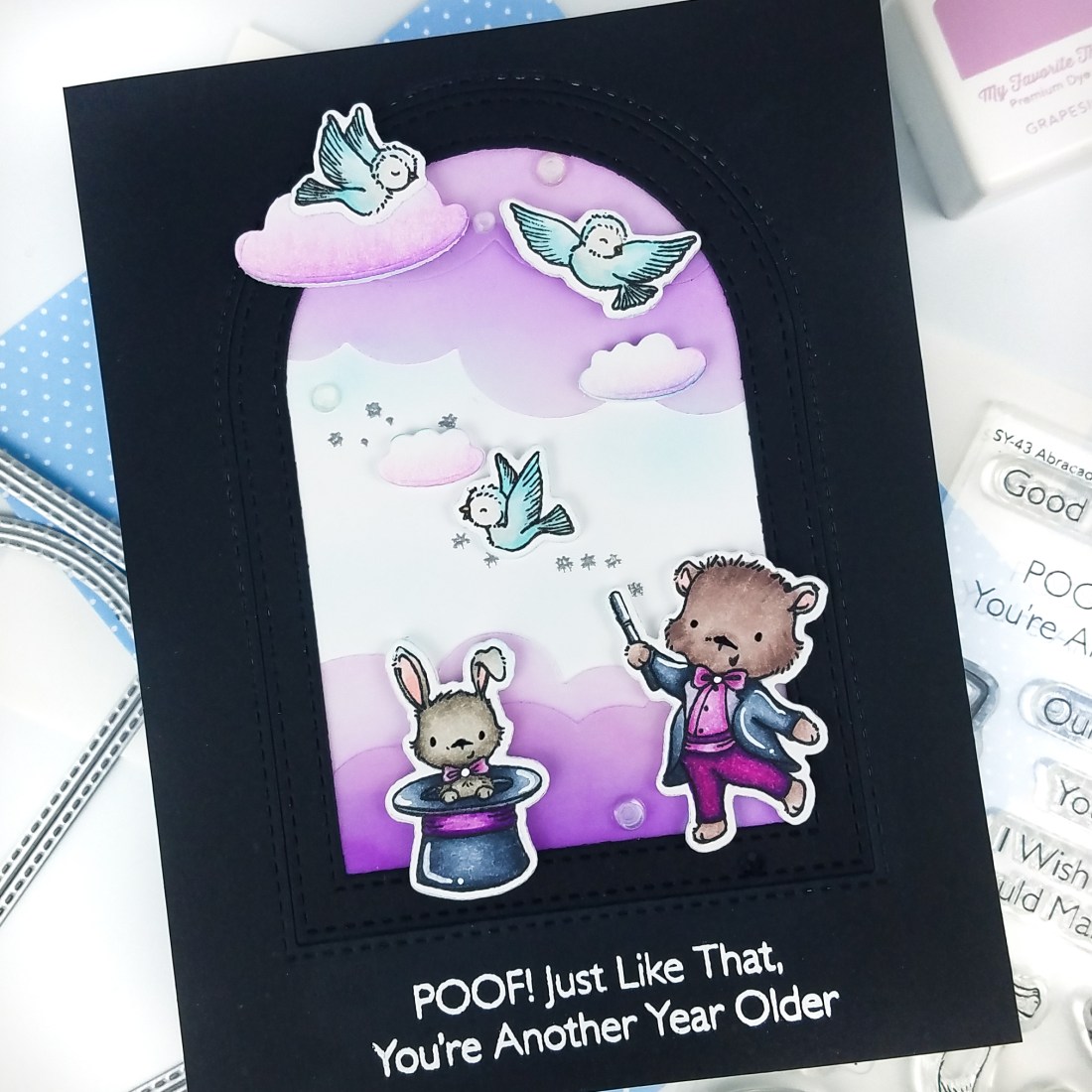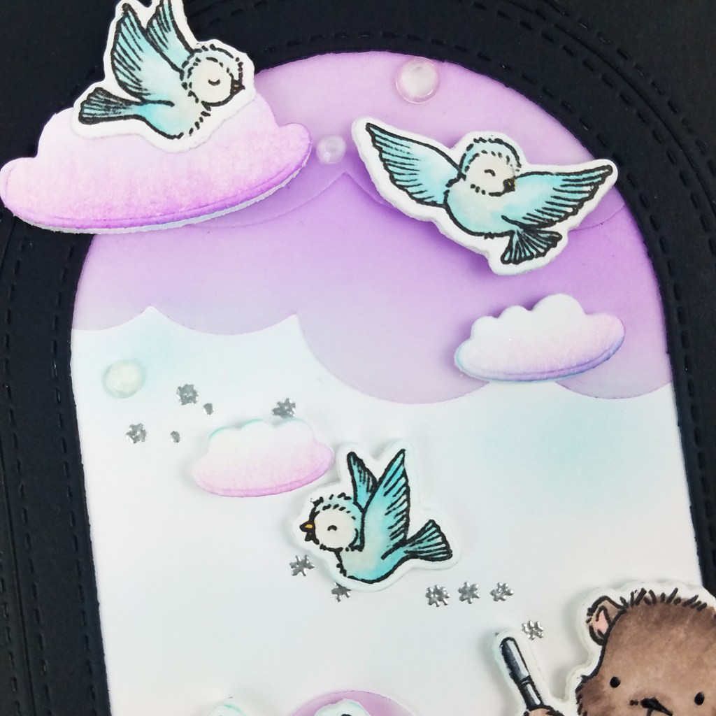 - Ink blend purple ink over the clouds and adhere them behind the black, arched frame at the top and bottom.