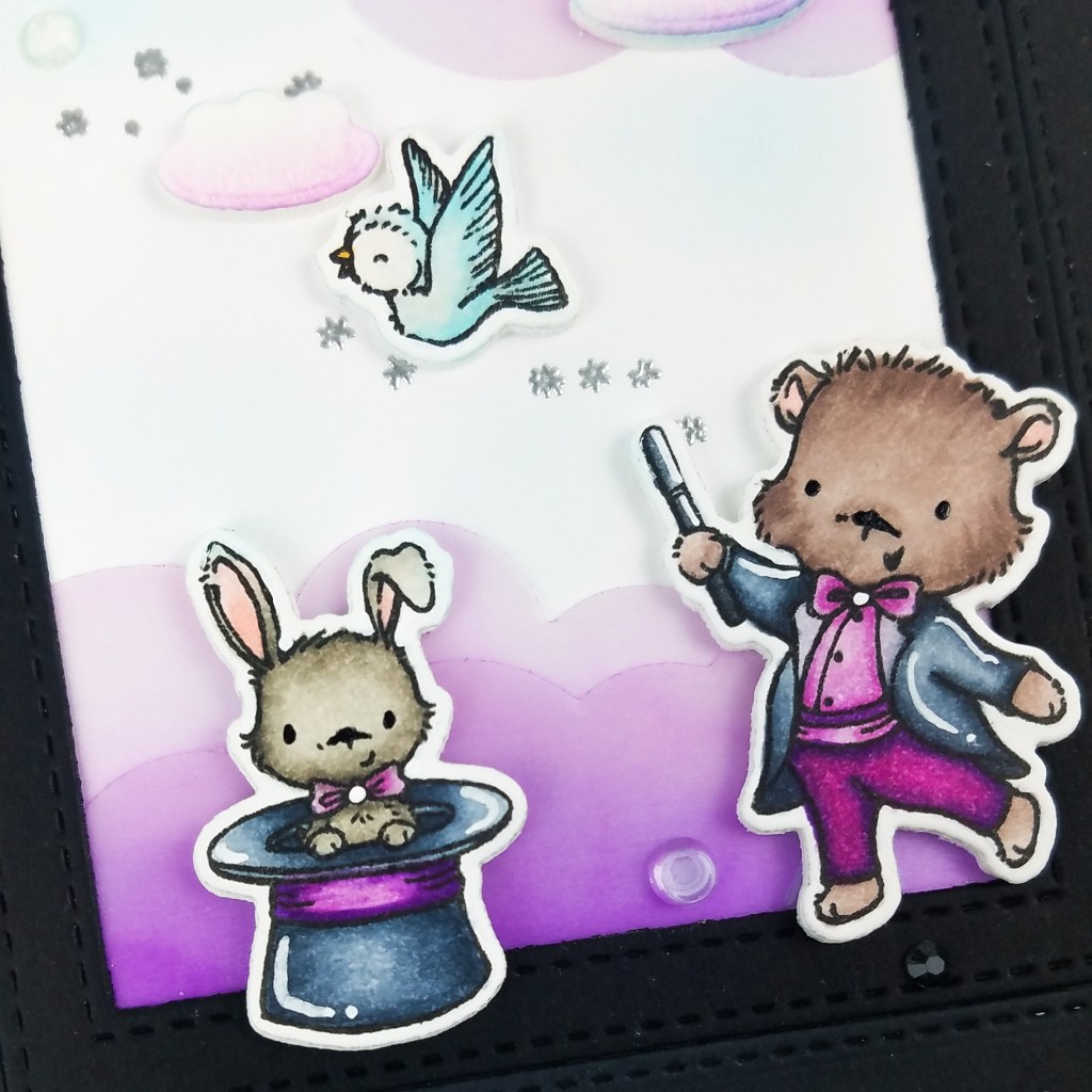 - Stamp and copic color several images from Abracadabra. Die cut with the coordinating Die-namics. Also die cut from fun foam for dimension.
