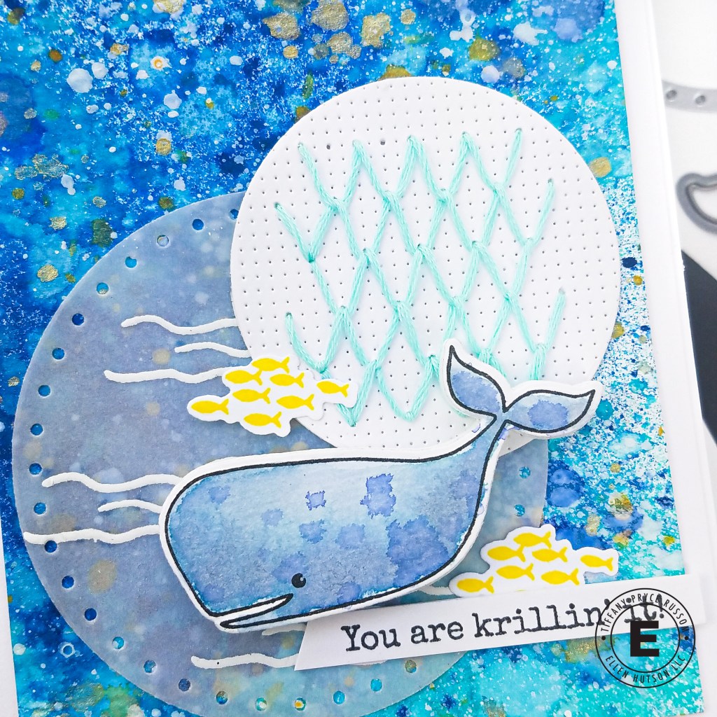 Next, using the EBE Essential Circles and the Essential Circles for Stitching dies, I die cut a circle from vellum. I stamped a few waves from the S’Whale stamp set in embossing ink and embossed in white embossing powder. I stamped and die cut the school of fish stamp twice. Finally, I stamped a whale in waterproof ink. I watercolored the whale very simply with distress inks. Once the whale was dry, I die cut it with the coordinating die.