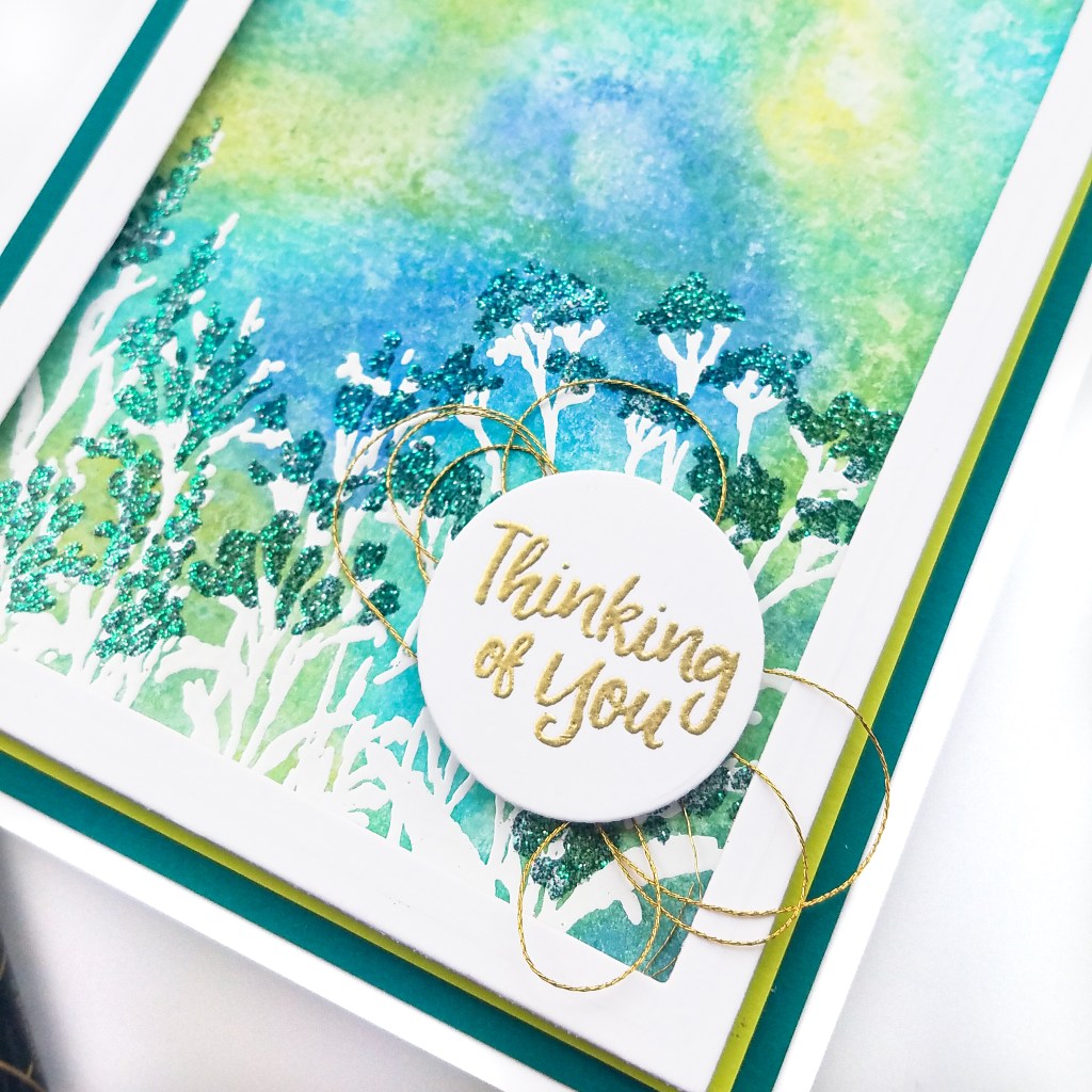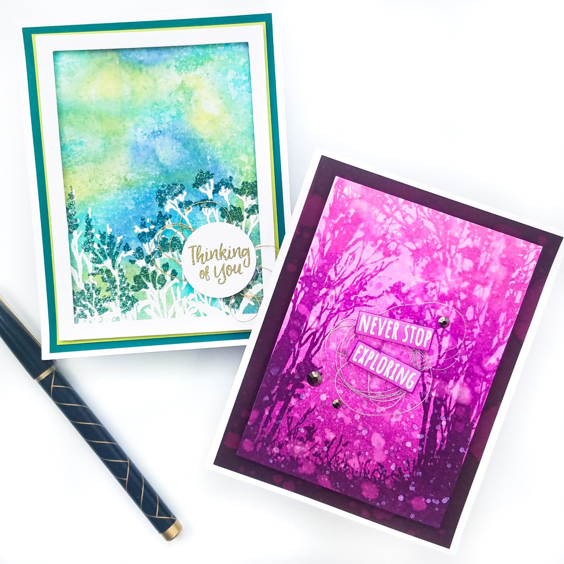 Happy weekend, crafty friends! I’m sharing a couple cards I made using some of the newest stamps from Spellbinders by Sushma Hedge – Forest Silhouette and Layered Wildflowers. I kept these cards fairly simple with stamping and some watercolor or mixed media techniques.
