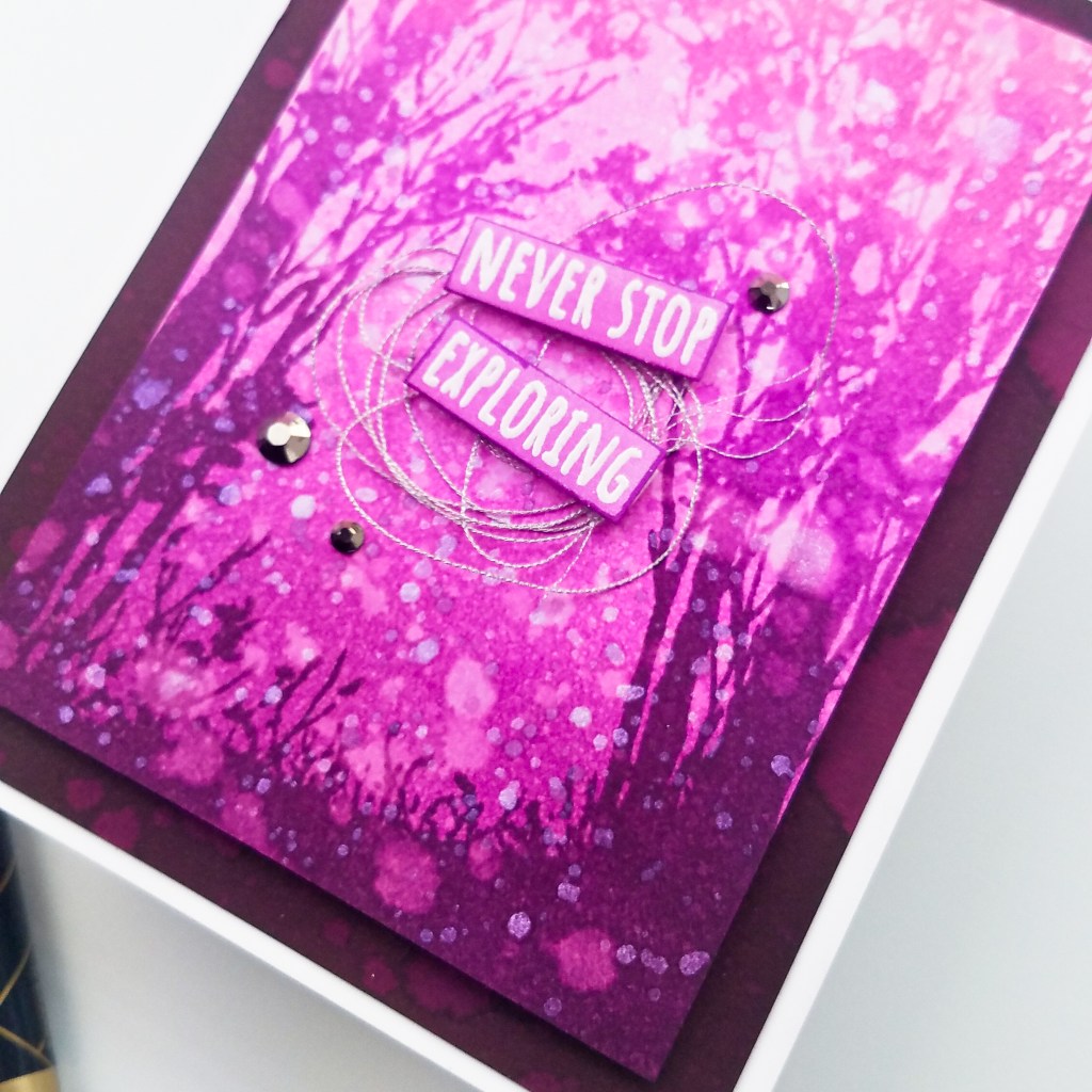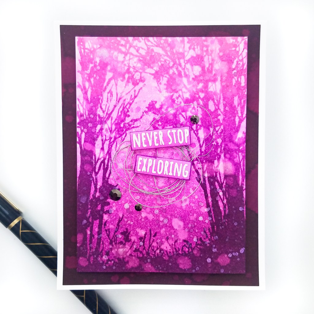 - On white cardstock, using several Catherine Pooler inks in the same color family, stamp Forest Silhouette several times. Use the darkest ink at the bottom to the lightest ink at the top. Between each color, soften the lines with a blending brush. I used Glam, Flirty Fuchsia, Pucker Up, and Be Mine.