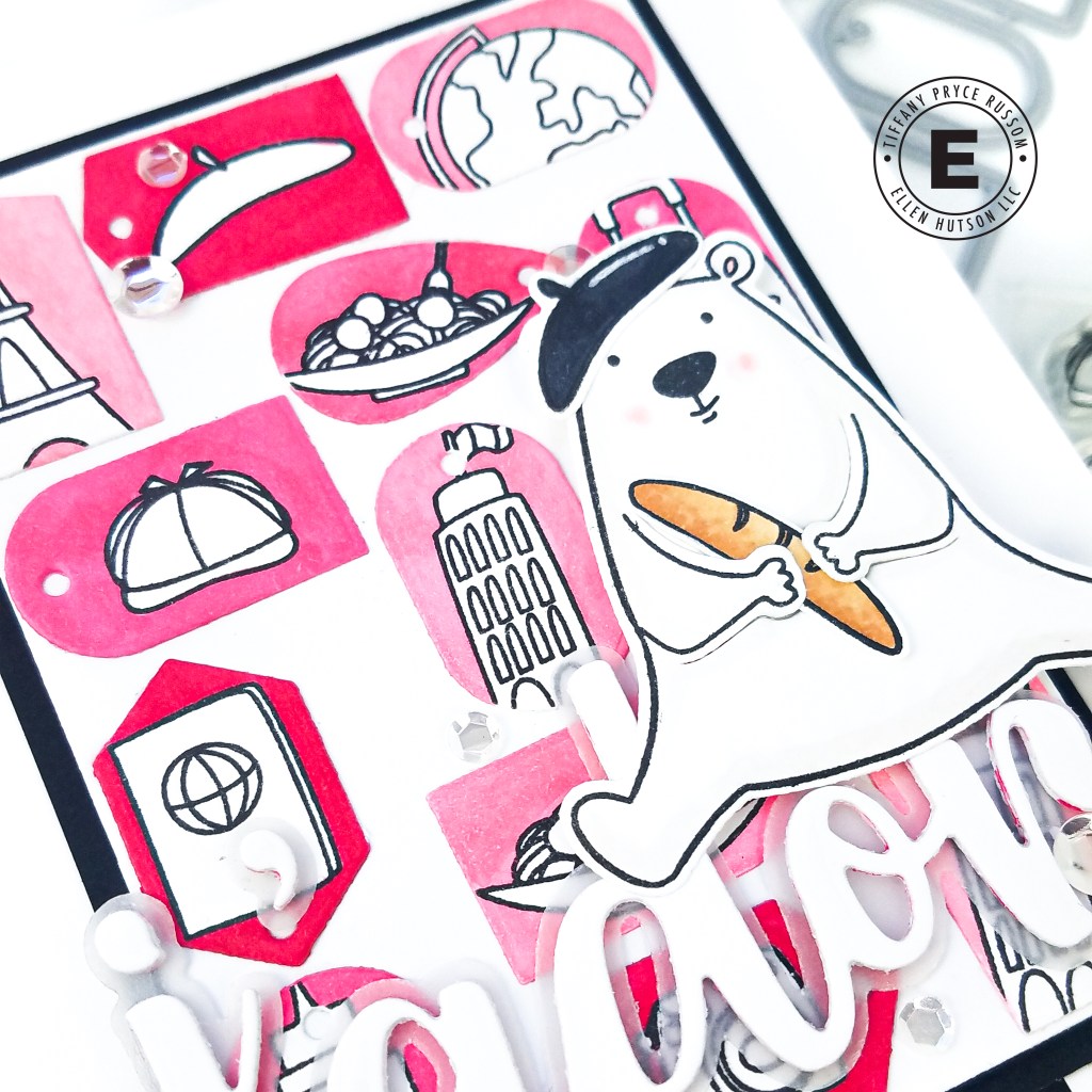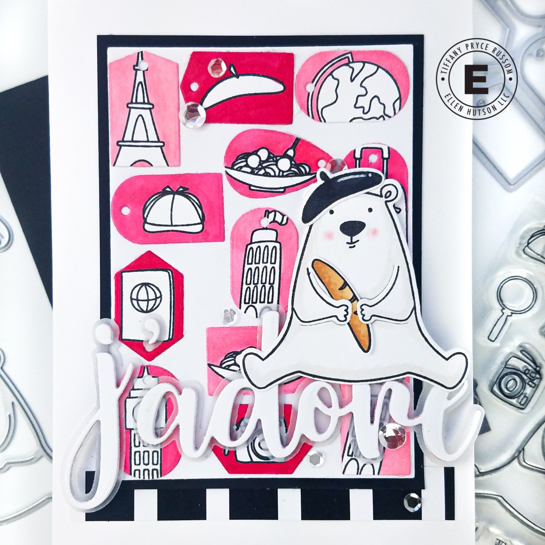 Hey there! Do you ever get struck with an idea and have to stop everything to make it? Well, that’s what happened to me last night! I was randomly looking through my sentiment die stash to see what I had and stumbled upon the Honey Bee Stamps Adore die. When this die came out, I had to have it because I love all things French, but I never actually used it. I recently got the Bear Ware Grand Tour stamp and die set from Ellen Hutson and knew that the two products would pair perfectly together. The result is this CAS, graphic card that I think is super cute. Check out the easy step-by-step below.