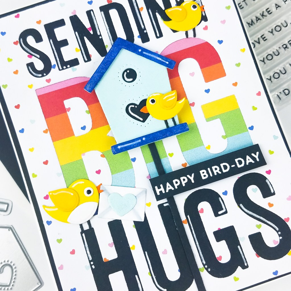 - Trim the heart patterned paper from the Happy Patterns paper pad to roughly 5 x 3.75 inches. Die cut the panel using the Sending Big Hugs Die-namics die.