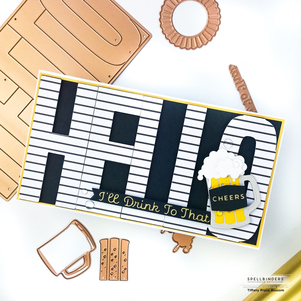For my last card, I made a CAS, mini slimline card. I used the Be Bold Color Block Hello You die and die cut it from patterned paper from the Christmas Traditions paper pad. I die cut the letters once from patterned paper, once from white cardstock, and once from black, fun foam for dimension. I love, love this foam. It gives the perfect amount of dimension and structure. To finish the card, I die cut another glass of beer and foiled two sentiments. I added a few clear drops for embellishment.