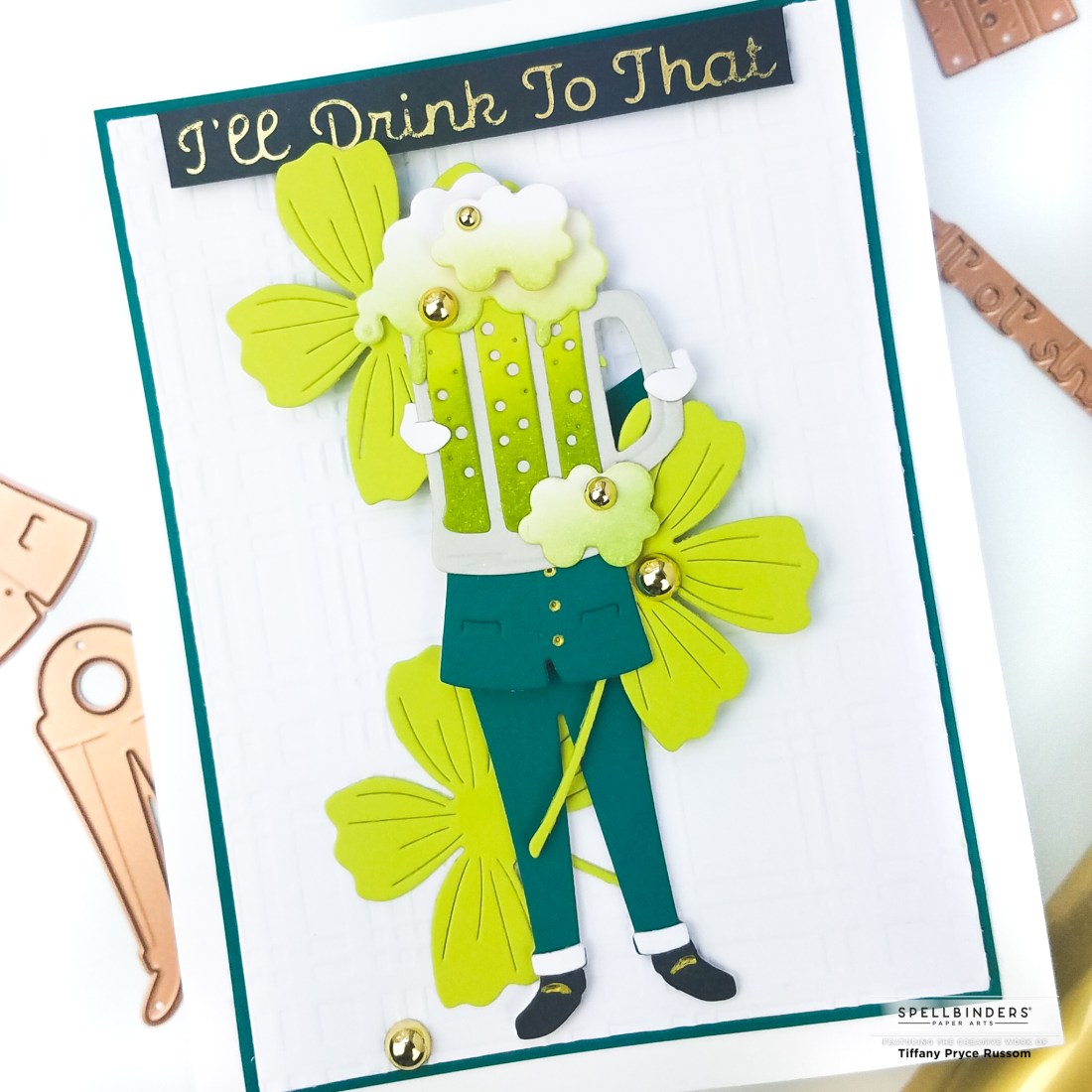 I used the Let’s Dance die set to create a dancing leprechaun! The legs swing back and forth similar to the Be Merry holiday card I made. So much fun! The man is easy to assemble by following the sample on the website. I die cut the pants and jacket from Spellbinders Blue Spruce cardstock and added detail with a gold gel pen. I doubled up the die cuts for the pants and jacket to make them a little sturdier. I die cut the beer glass from Peridot and Silver Fox cardstock. The foam was die cut from Snowdrift cardstock. I lightly ink blended some green ink at the bottom of the “green beer” and the foam for dimension. I love how cute this glass of beer is!