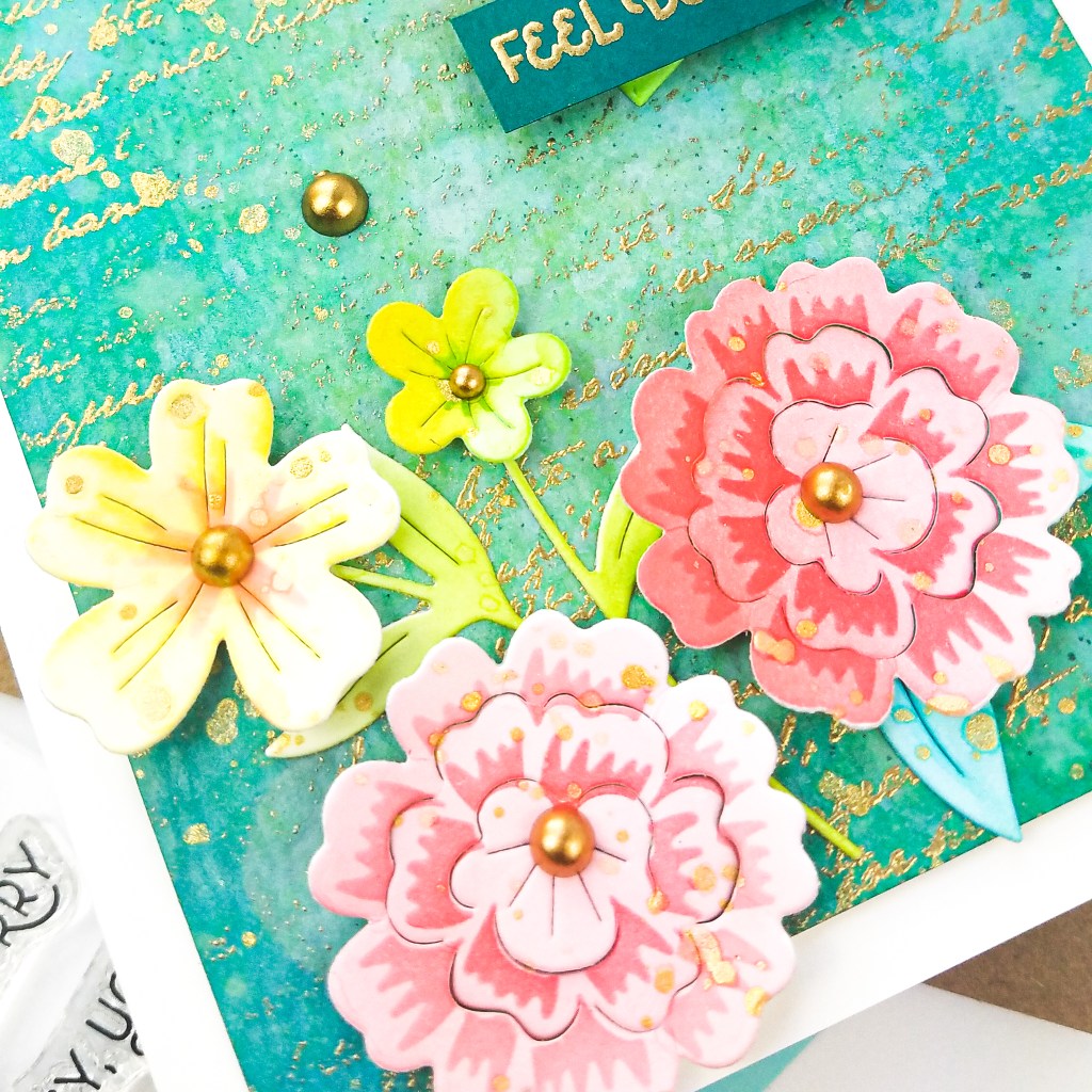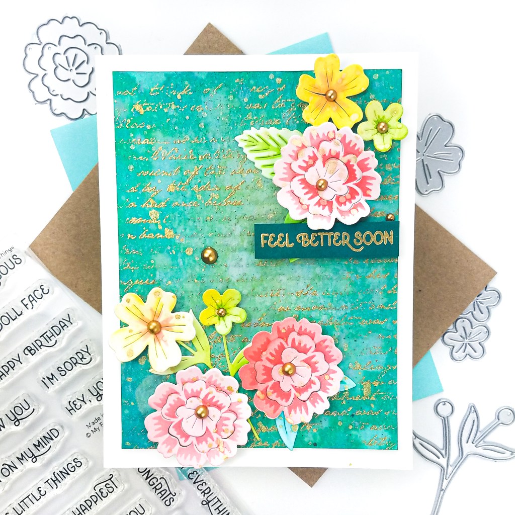 - Stencil several flowers and leaves on white cardstock and then die cut with the coordinating die-namics. I love the added dimension the die cut lines add to the stenciling.