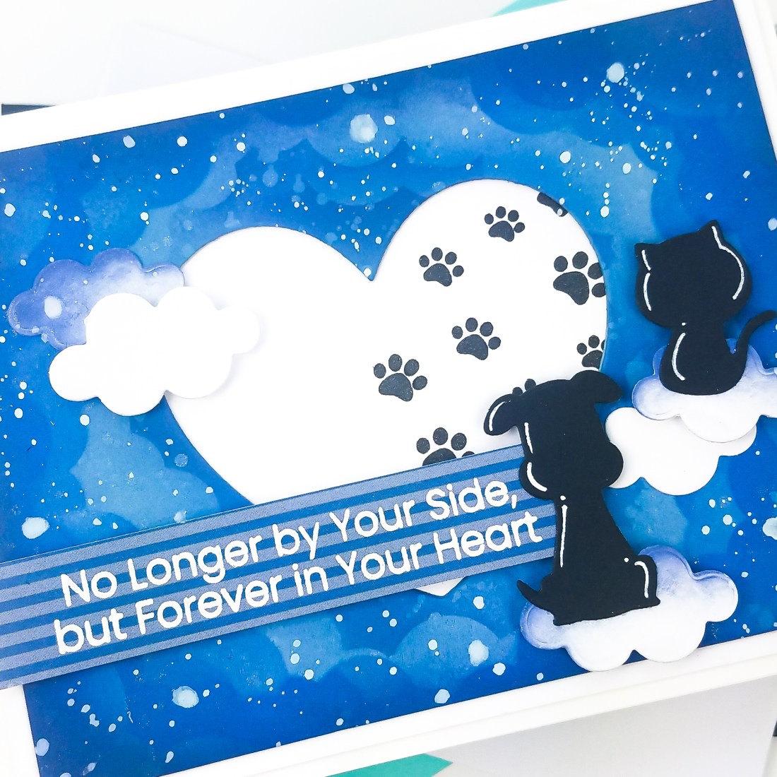 7. Using a strip of patterned paper from the Pawsome Prints Paper Pad, white heat emboss a sentiment from the Rainbow Bridge Goodbyes stamp set. Adhere with foam tape.