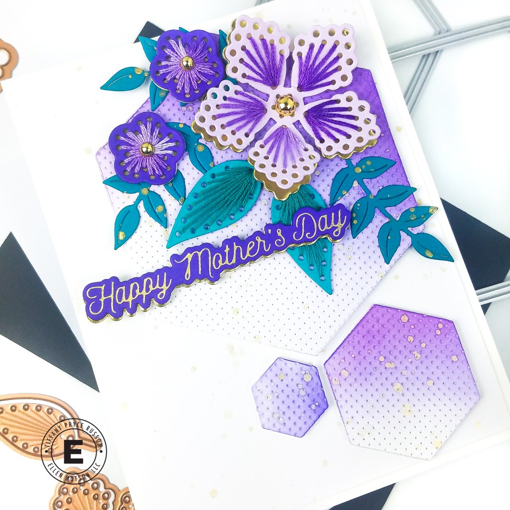 - For the sentiment, gold foil the Mother’s Day sentiment from Spellbinders Happy Parents Day Glimmer plate on purple cardstock. Die cut with the coordinating die. This glimmer plate will be a staple year after year.