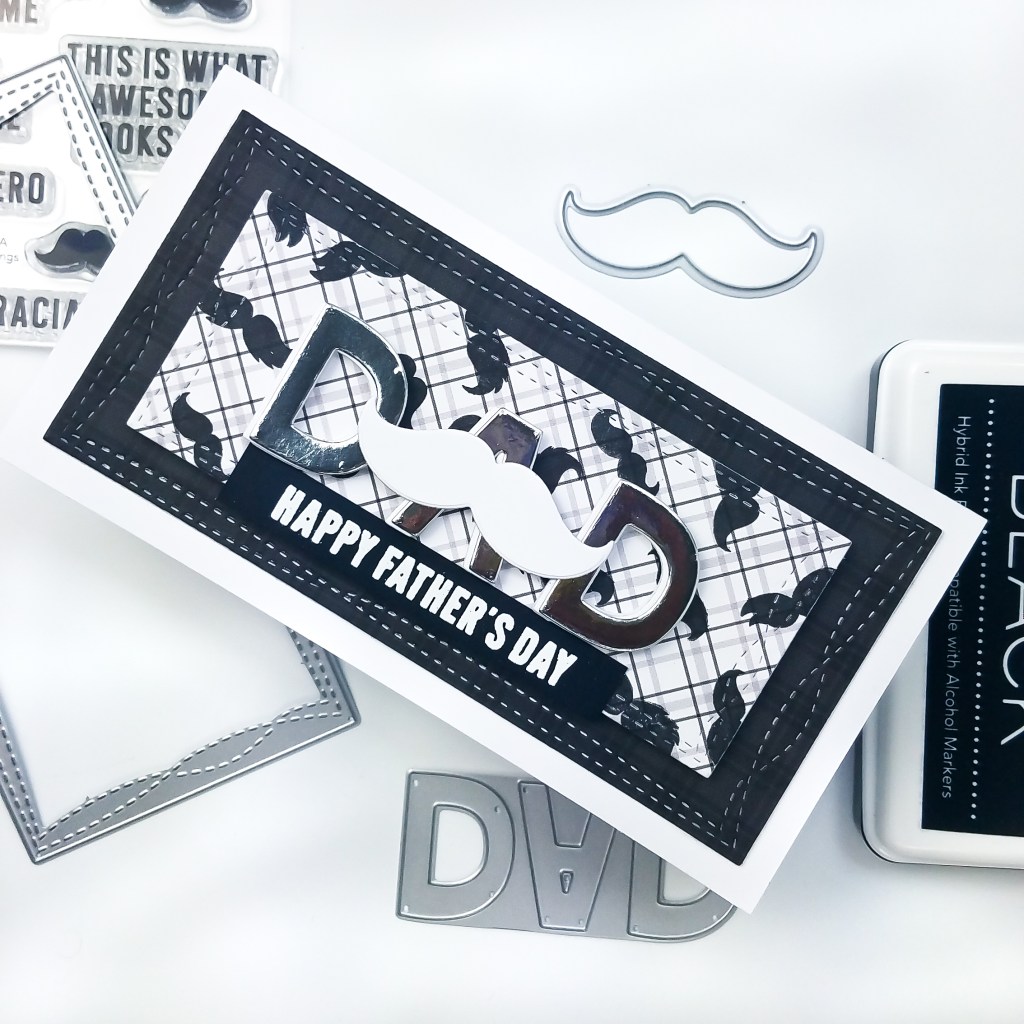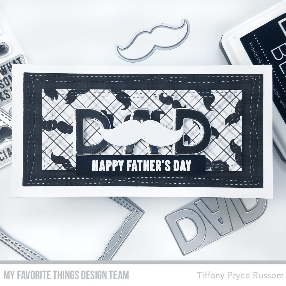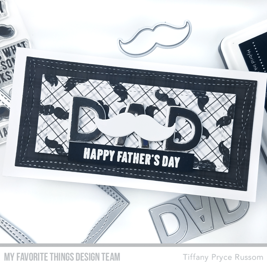 - White heat emboss a sentiment from Super Stache on black cardstock and adhere below ‘Dad’.