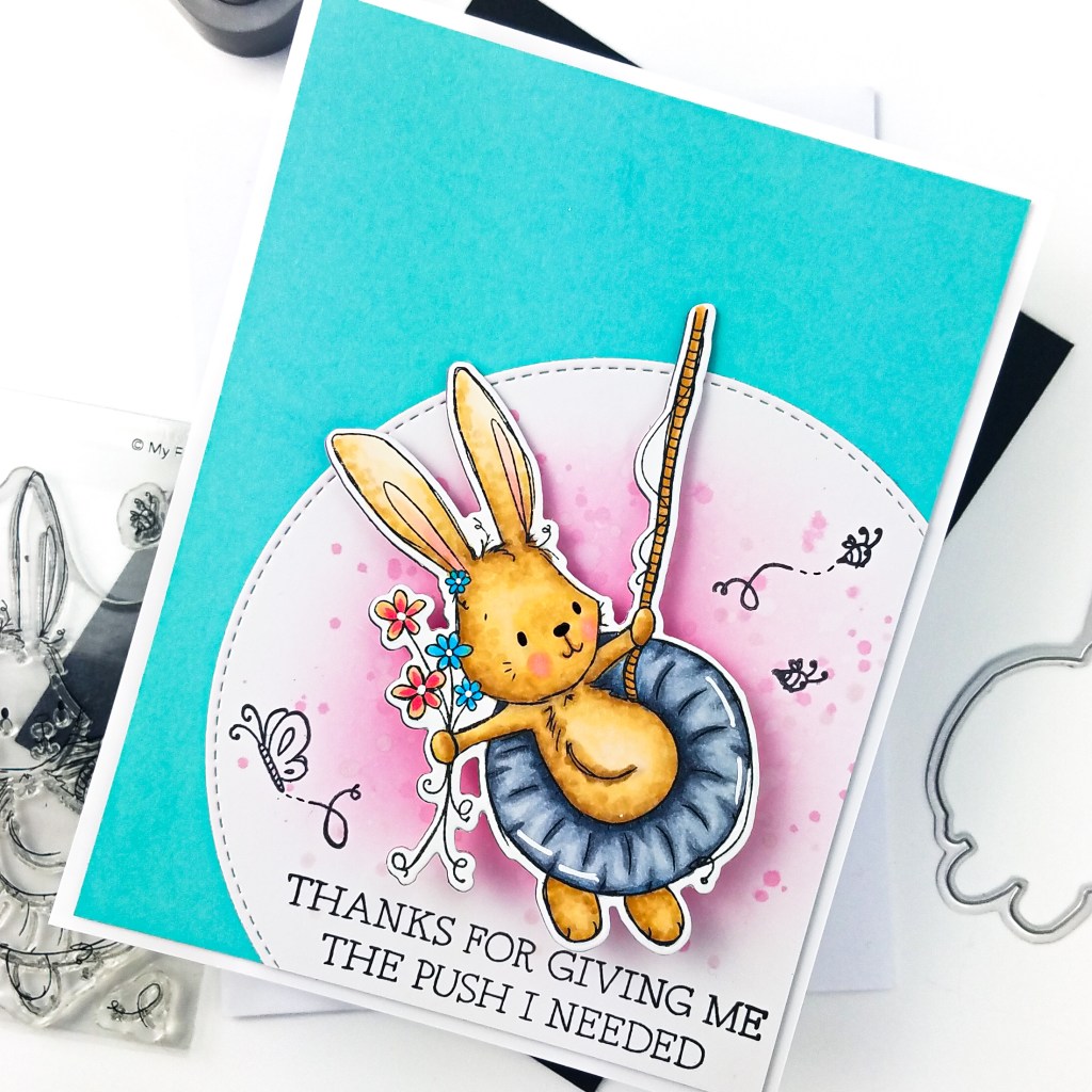 Only 2 days left until the new MFT release! I think this stamp set illustrated by Rachelle Anne Miller, called Beautiful Bunny, is super cute! This could be paired with the new Under the Treetop Die-namics or used on it’s own like I did here. Doesn’t this bunny look like it’s having a blast? To add to the effect, I made this an interactive card by placing the main image on a wobbler. Check out my corresponding post on IG to see it in action!