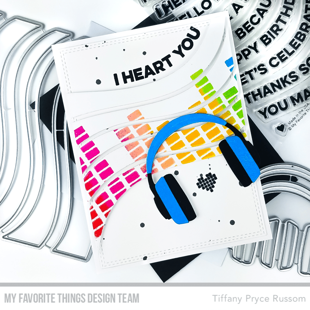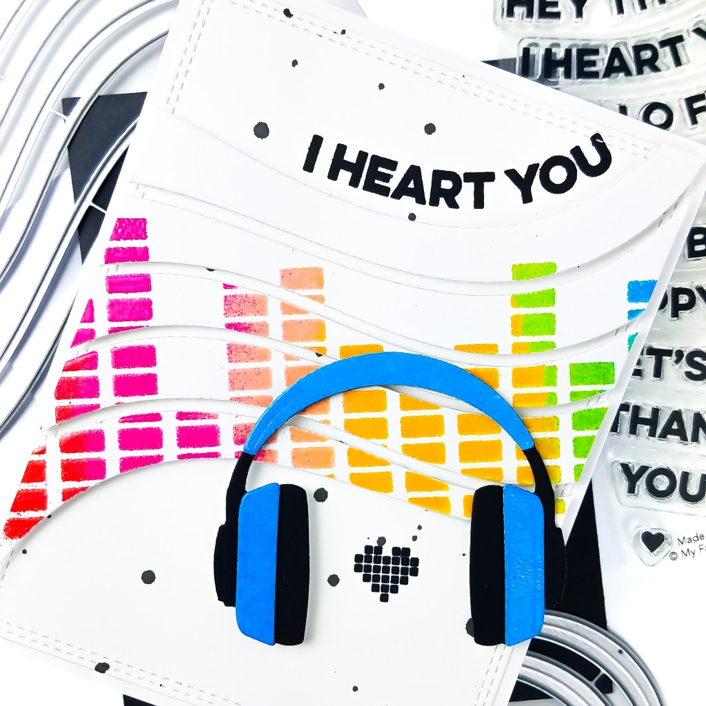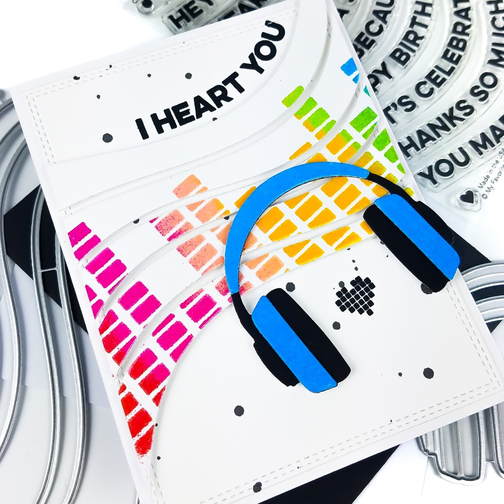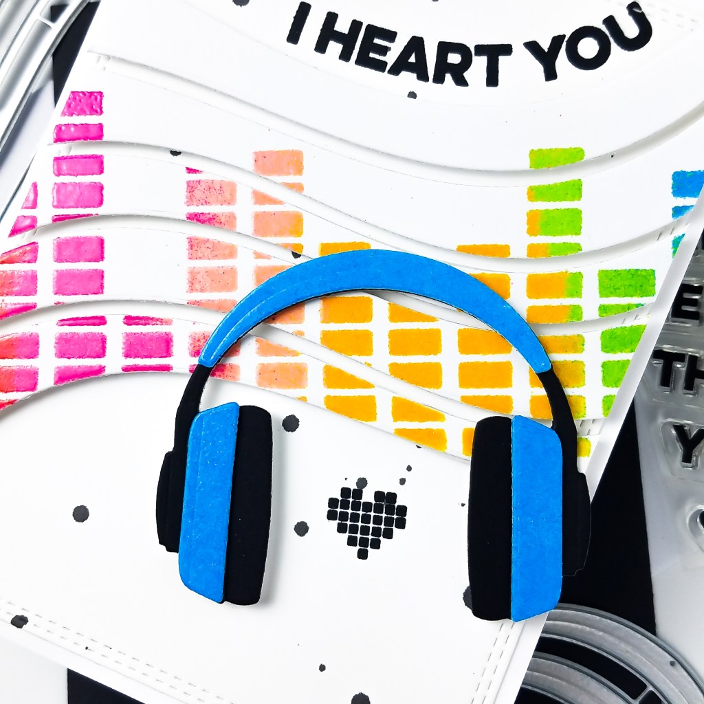 - Die cut and assemble the Headphones Die-namics. On the accent pieces, cover in embossing ink and use the salty ocean distress embossing glaze to add color. Add the completed headphones to the card front.