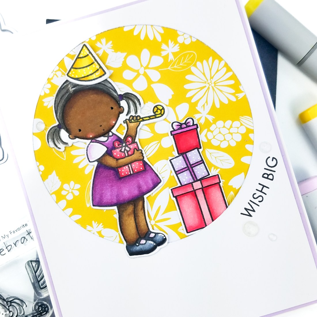 - Stamp and copic color the cute little girl and hat from PI Happy Birthday to the Sweetest Girl. Die cut with the coordinating die-namics.