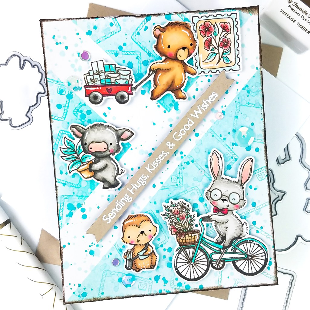 - Stamp and copic color several images from SY Happy Mail. Die cut with the coordinating die-namics. I stamped the images in MFT Vintage Timber and copic colored them. I did not know I could copic color with the MFT dye ink, but looks like you can! I usually only stamp in black so stamping in dark brown was a fun change.