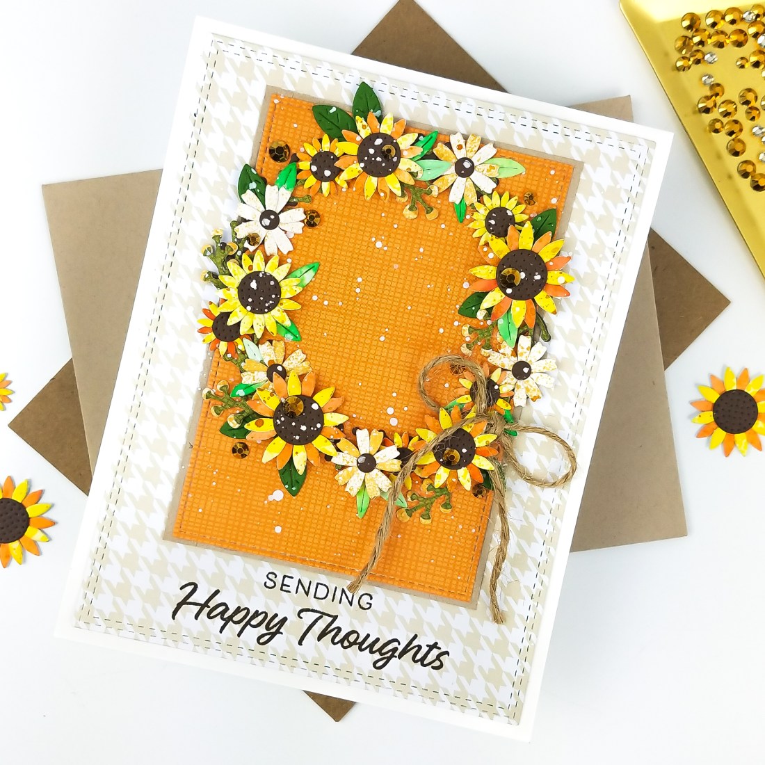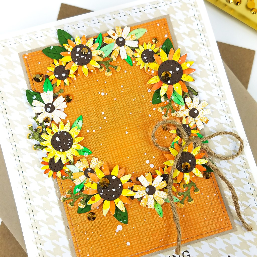 - Die cut several flowers using the Sunflower Wreath Die-namics from the yellow, orange, and gold panels. Die cut the leaves from the green panel and solid green cardstock. Die cut the flower centers from solid brown cardstock.