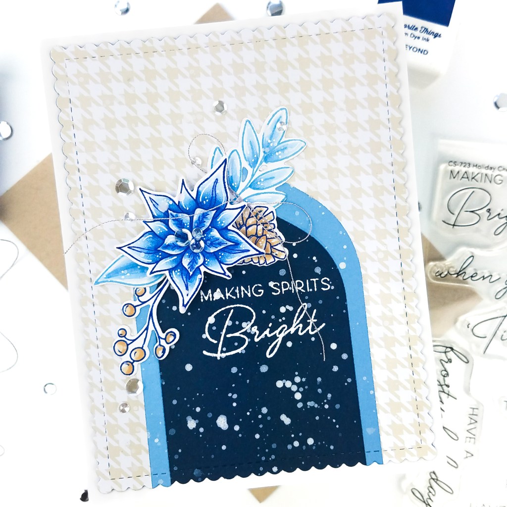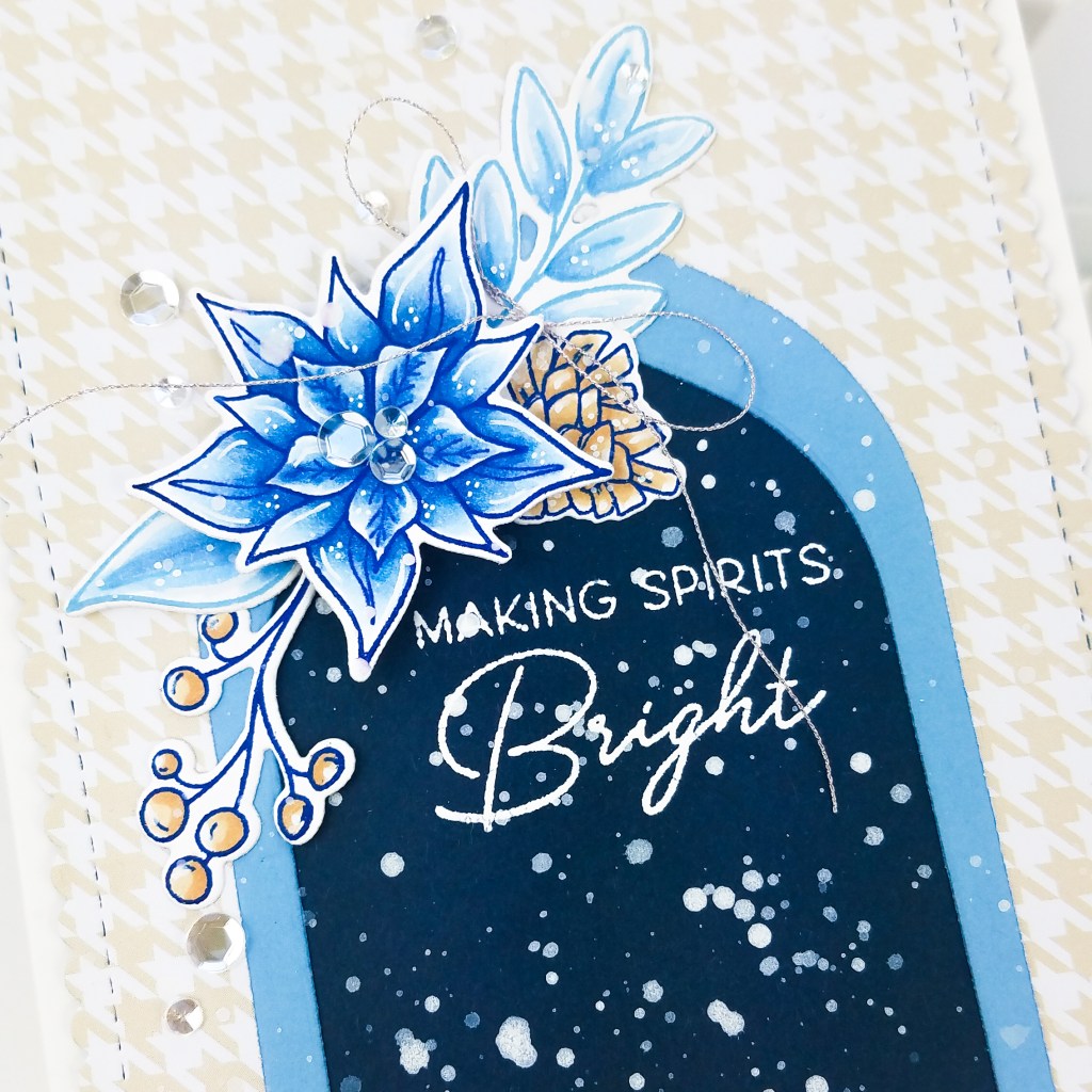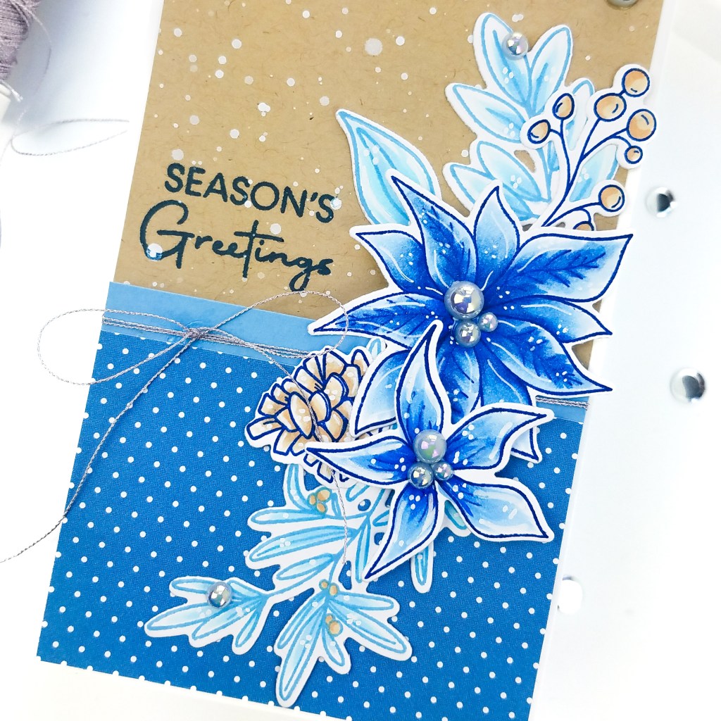 - Stamp a sentiment in dark blue ink from the Pretty Poinsettia stamp set.