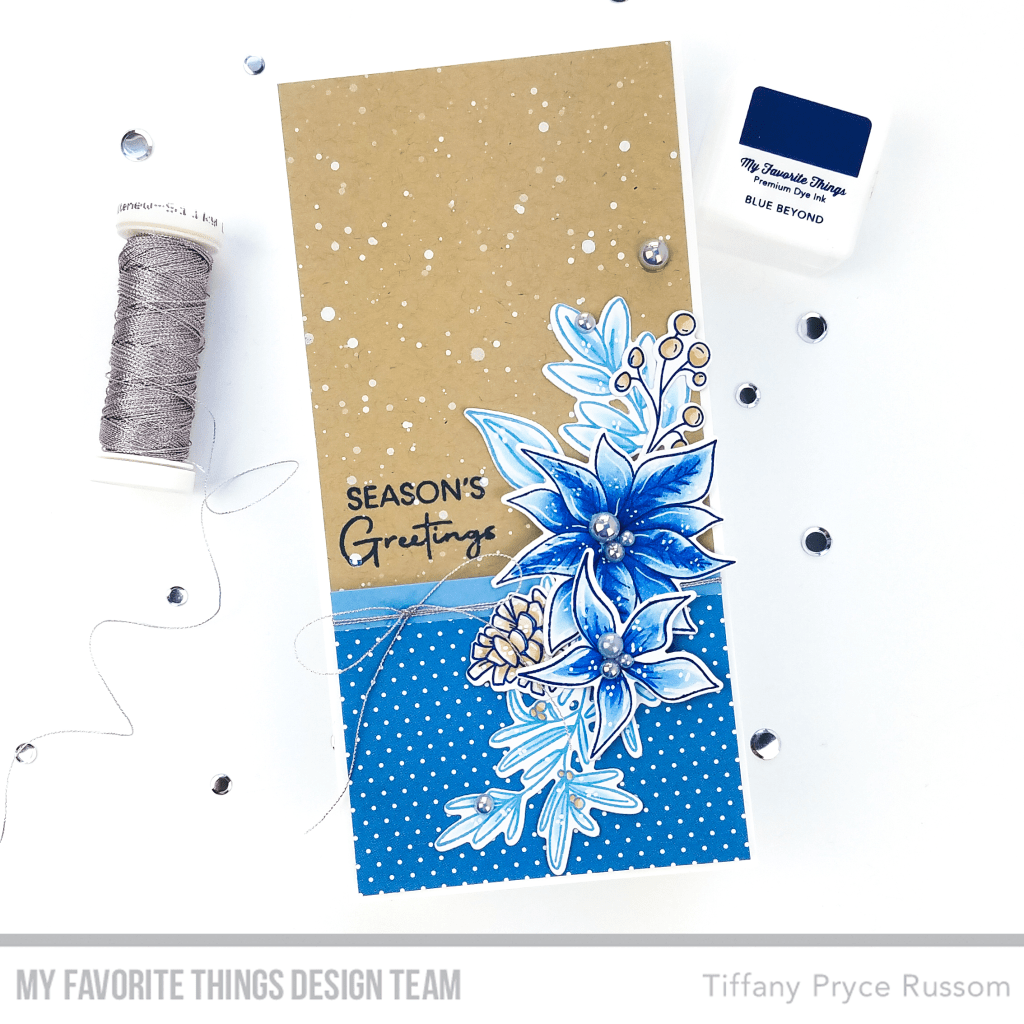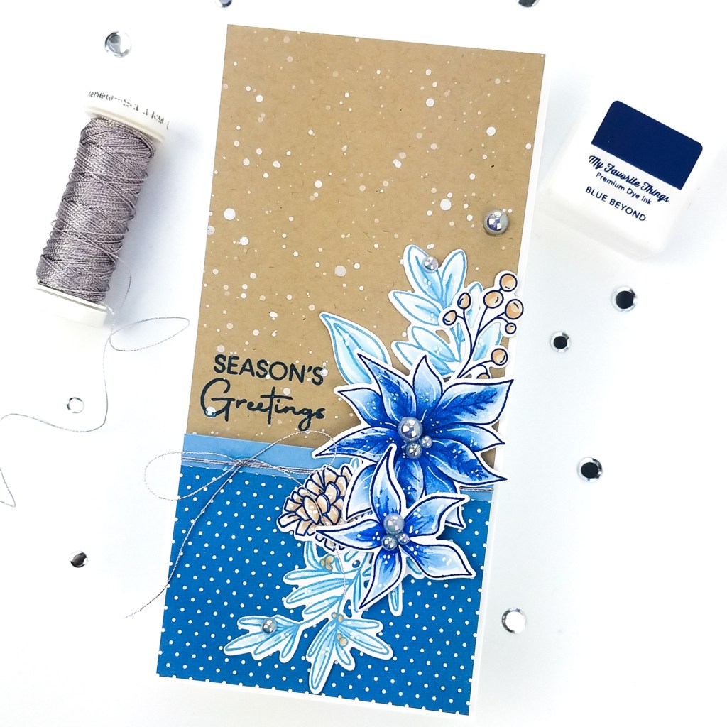 - Stamp several images for both cards from the Pretty Poinsettias stamp set. Copic color and then die cut with the coordinating die-namics. I stamped the images in MFT Blue Yonder dye ink and MFT Lazy Day dye ink. I copic colored with no problem at all with these inks. I used the following colors: B18, B37, B21, B34, B00, E31, and E34. Add white pen detail on the flowers and leaves.