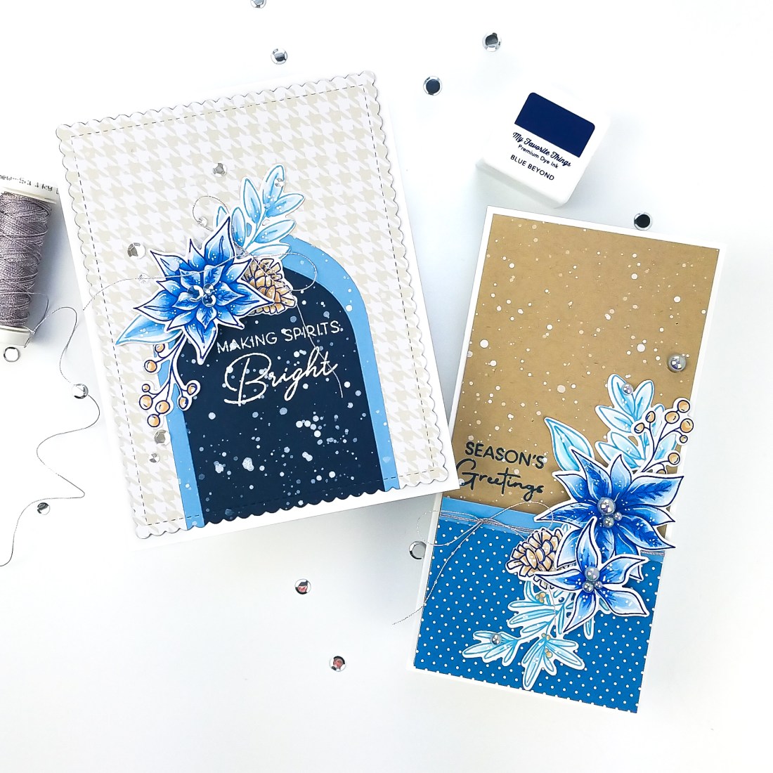 - Stamp several images for both cards from the Pretty Poinsettias stamp set. Copic color and then die cut with the coordinating die-namics. I stamped the images in MFT Blue Yonder dye ink and MFT Lazy Day dye ink. I copic colored with no problem at all with these inks. I used the following colors: B18, B37, B21, B34, B00, E31, and E34. Add white pen detail on the flowers and leaves.