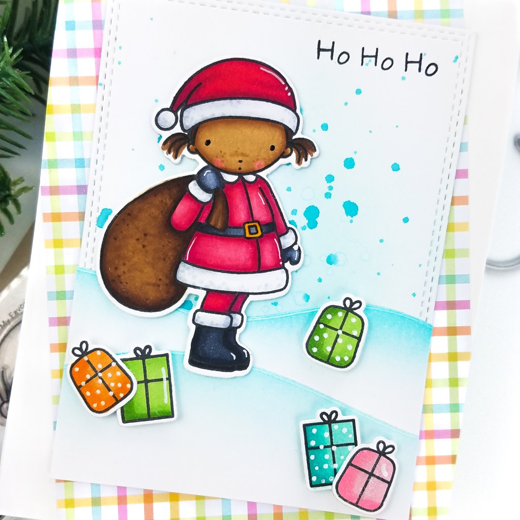 I have another MFT project to share today. I’ve been playing with more Christmas designs and I noticed that I had not used this new stamp set yet; it’s the PI Christmas Sweetheart stamp. This little girl dressed as Santa is so cute. This card is my version of clean and simple and was easy to make.