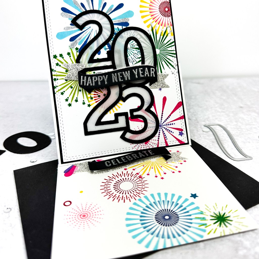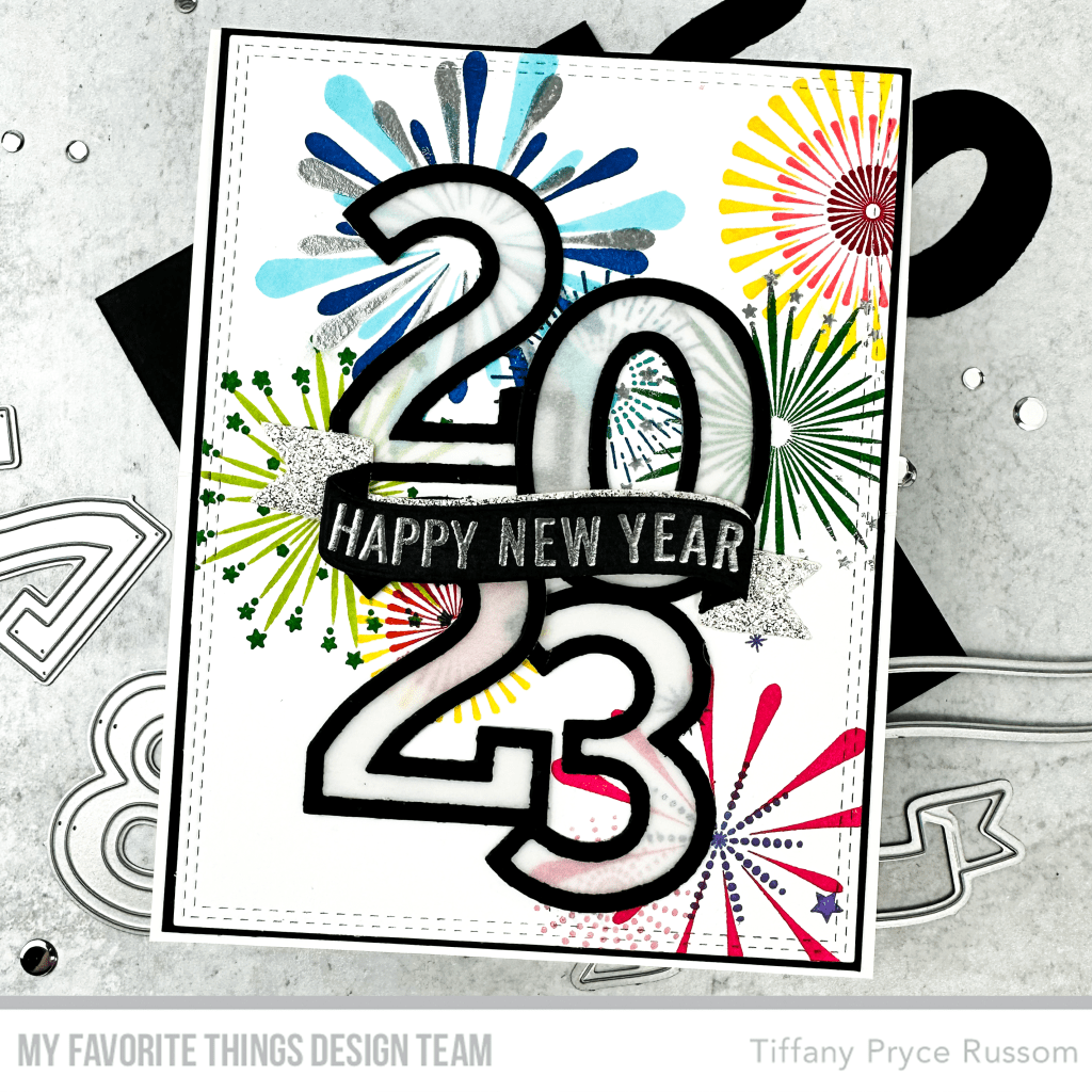 Welcome to Day 5 of the countdown to the new MFT Stamps release! Can you believe it’s the last full release of 2022? Yes, there will be a card kit (and again, you will LOVE it). As we wind down the year, I’m feeling good about 2023. How about you? To celebrate the new year, I created this fun and colorful card using brand new products. I thought rainbow fireworks would be so pretty and festive and little different than the classic gold, silver, white, and black for New Year’s.