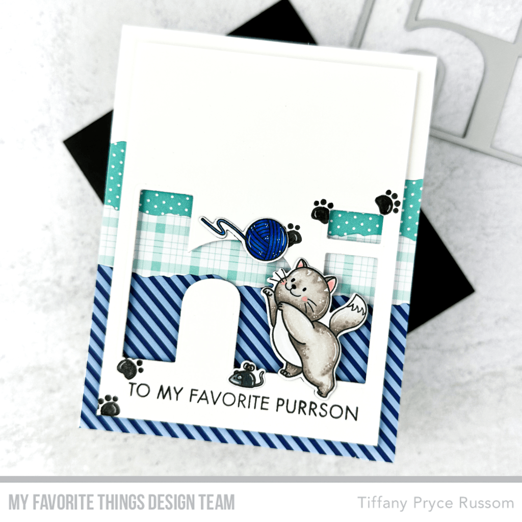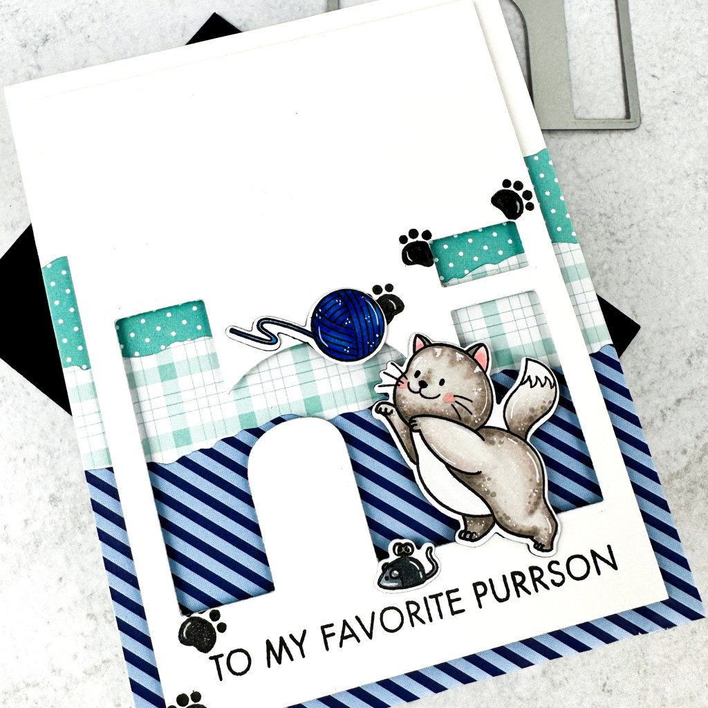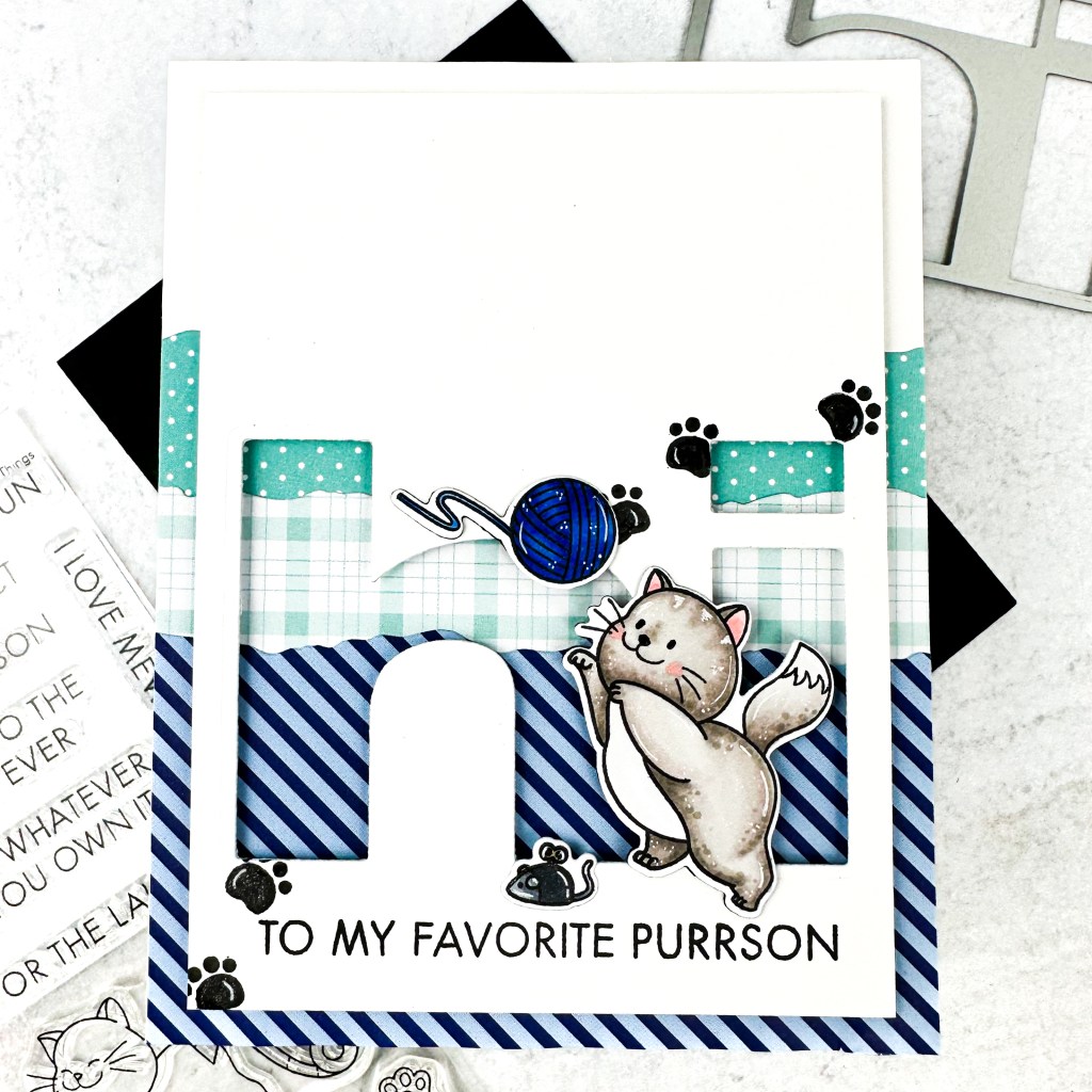 Welcome to countdown day 1! Only one more sleep until another amazing MFT release. I hope you’re loving it so far! Do you prefer stamps or dies? I think I’m split and like both equally depending on the product and my creative mood. Today, I combined stamps, dies, and patterned paper for a cute design for a cat lover.