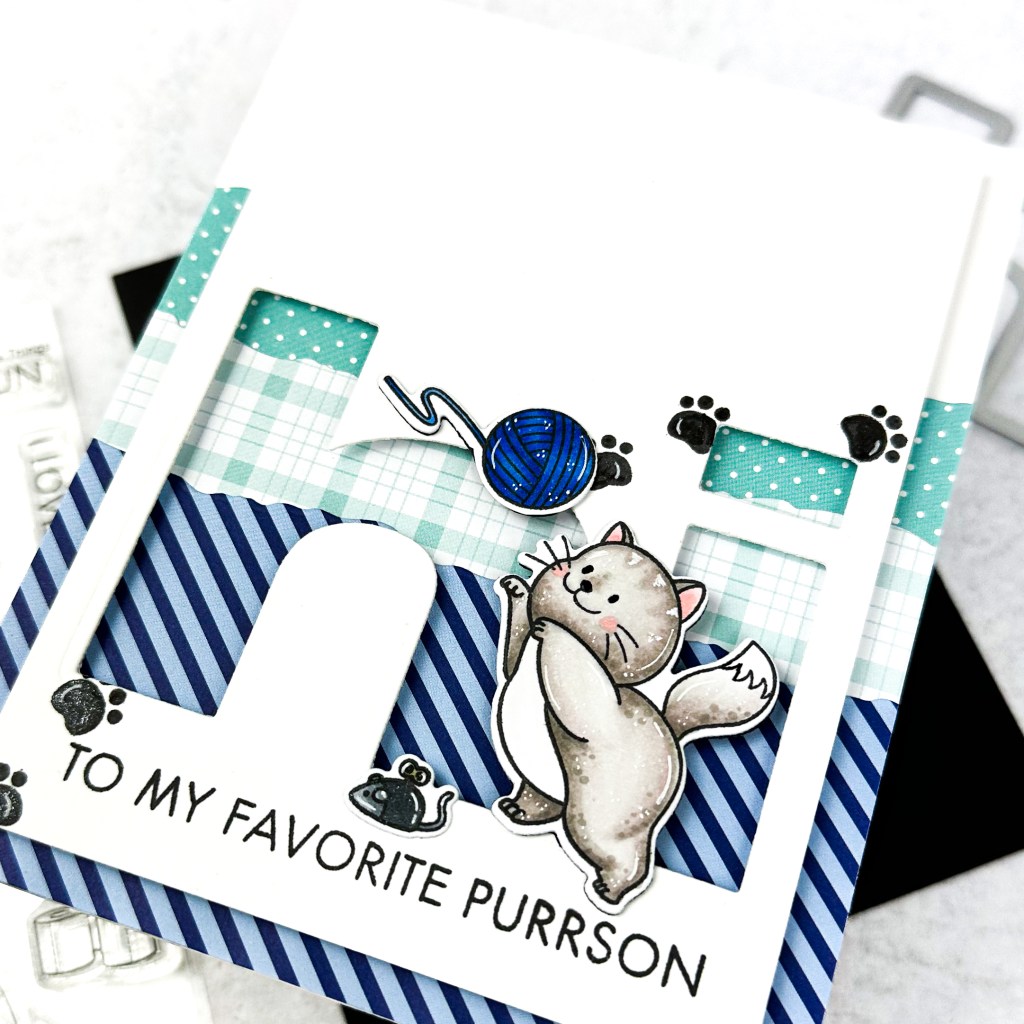 - Stamp a sentiment in MFT Extreme Black ink at the bottom and paw prints from the YUZU Catitude stamp set.