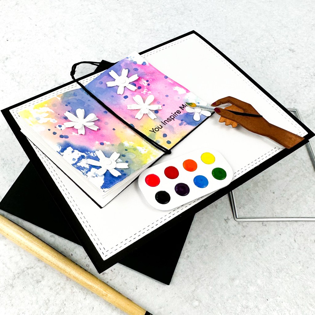 I had so much fun creating this sample! I had a crafty friend in mind when I created this so I can’t wait to send it and brighten her day a bit. I want to encourage you to think outside the box with your supplies. I’m not sure these dies were meant to create a little book or art journal, but it worked perfectly! I kept it pretty clean and simple to keep the focus on the art journal and watercolor palette.