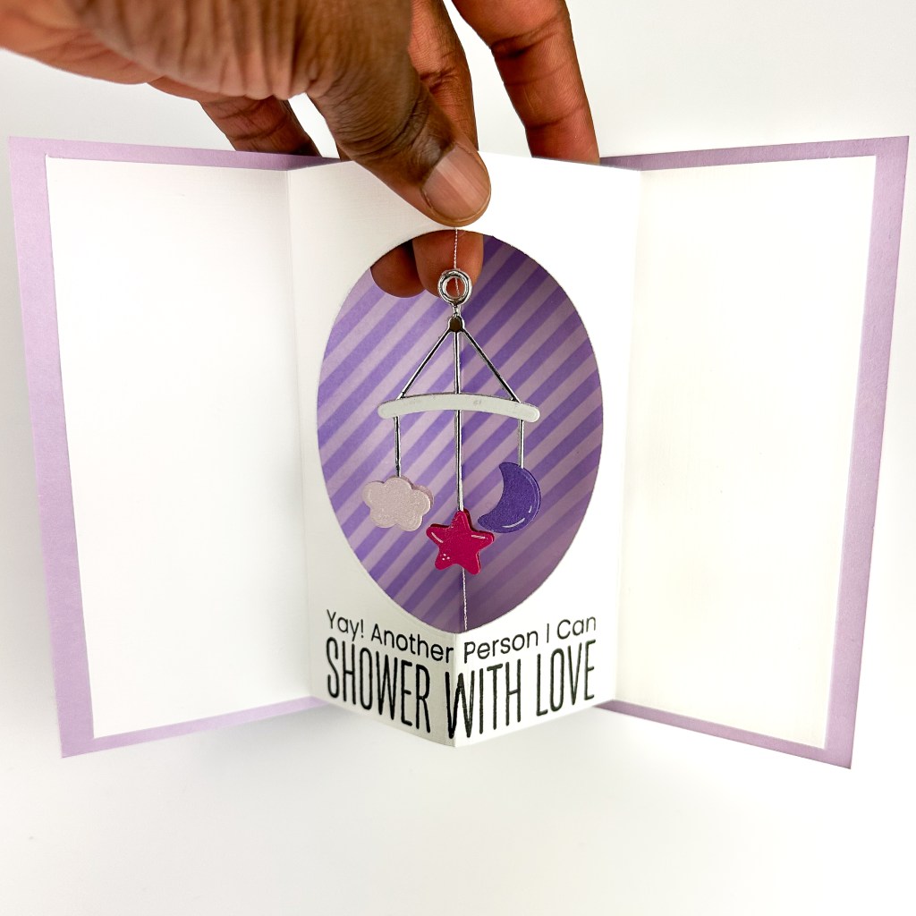 - Using the It’s a Baby Die-namics, die cut the pieces for the diaper and the mobile. Die cut multiple layers for the mobile to make it very sturdy. Die cut the cloud, moon, and star twice. The front and back of the mobile needs to look the same. Make sure to add string in-between one of the layers in the mobile so it can hang in the circle window. I used Grapesicle, Grape Jelly, Ripe Raspberry, and silver cardstock for these elements.