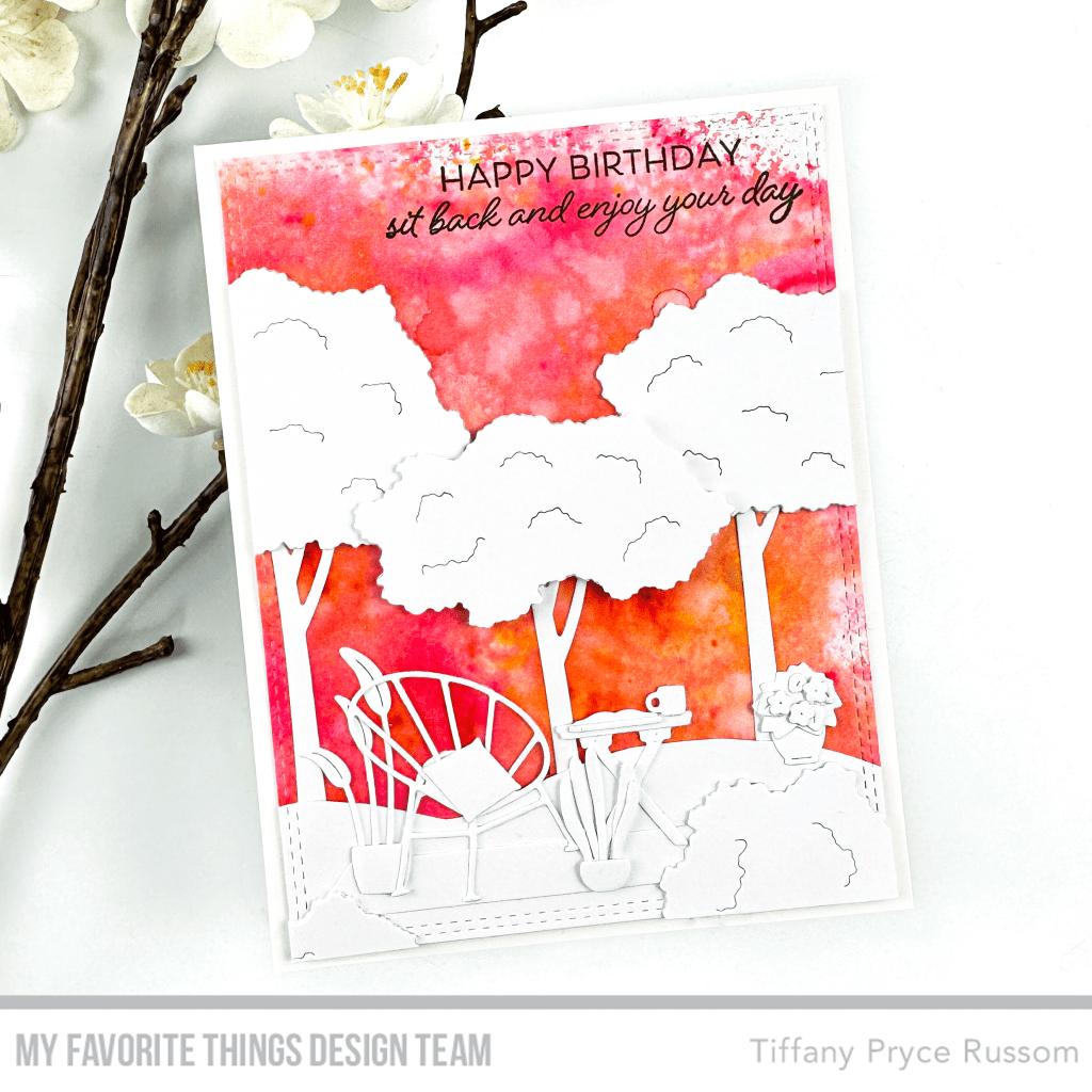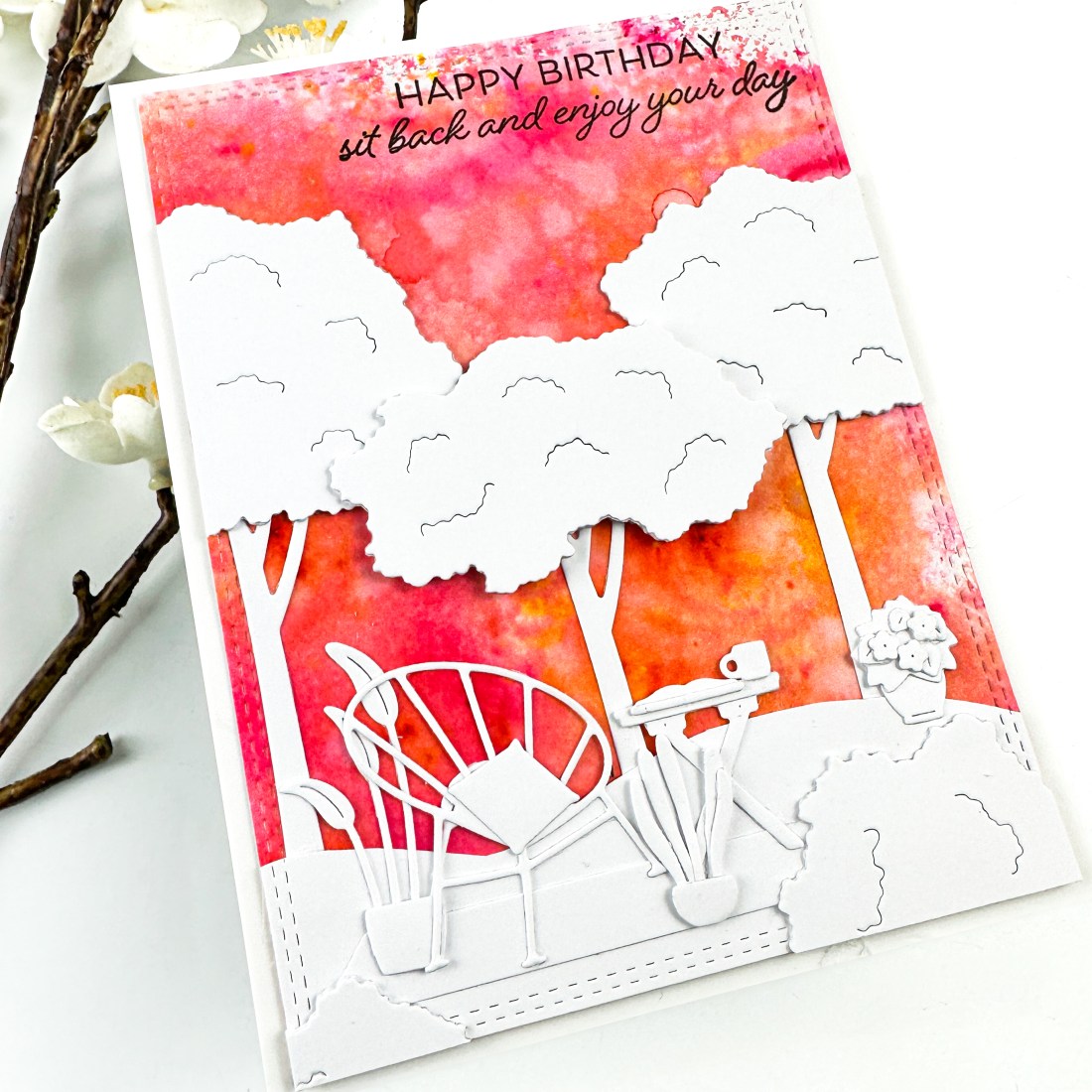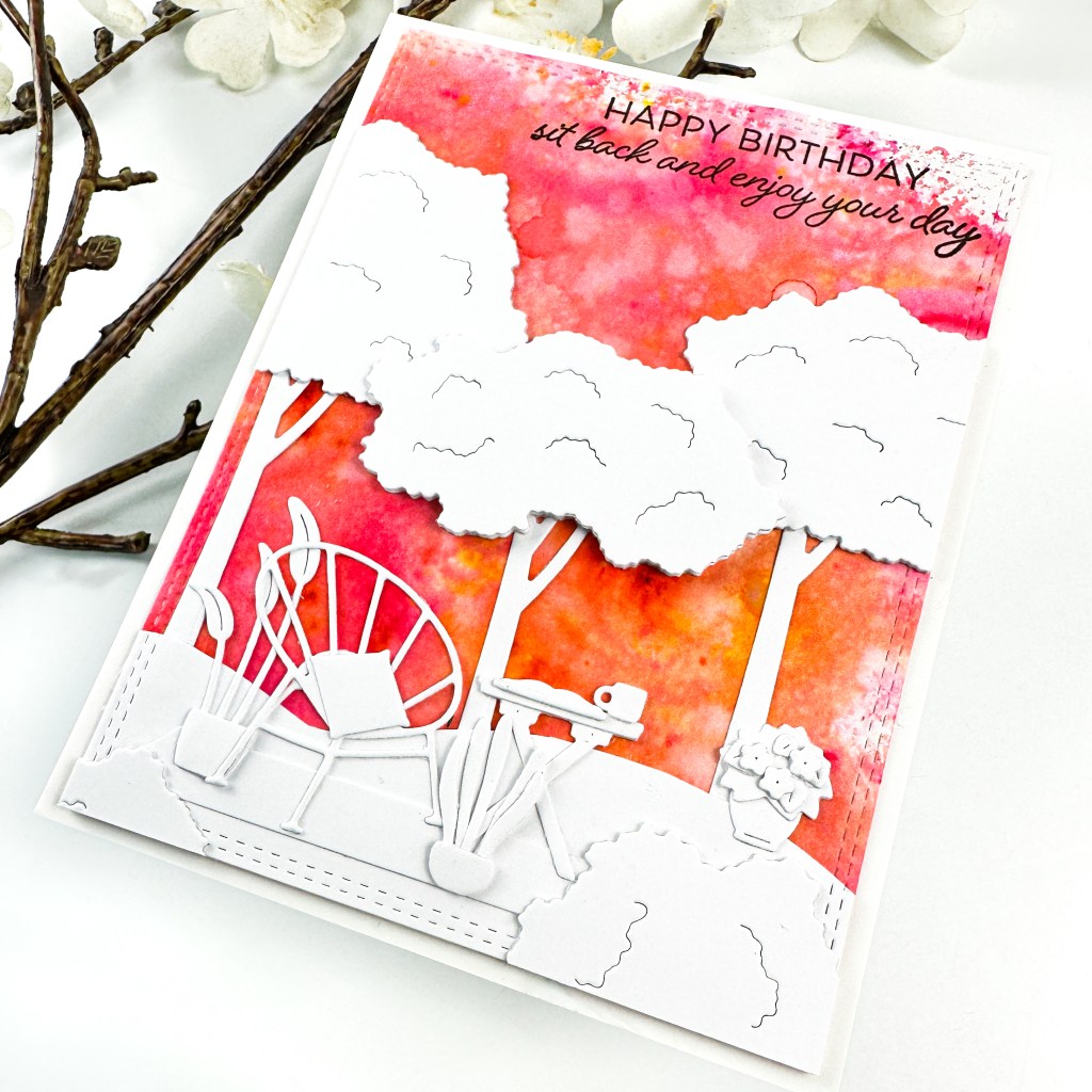 This card was super easy to create! On mixed media paper, I sprinkled yellow, red, and orange pigment powder. I sprayed the powder with water until the granules dissolved. I love the way the color separates and bursts to create a vivid, fun background. While the background was drying, I die cut several pieces to create the scene. I used the following die sets: