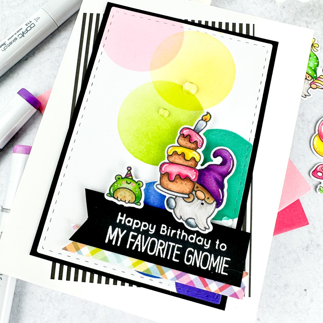 - Stamp, copic color, and die cut images from Happy Birthday to My Favorite Gnomie.