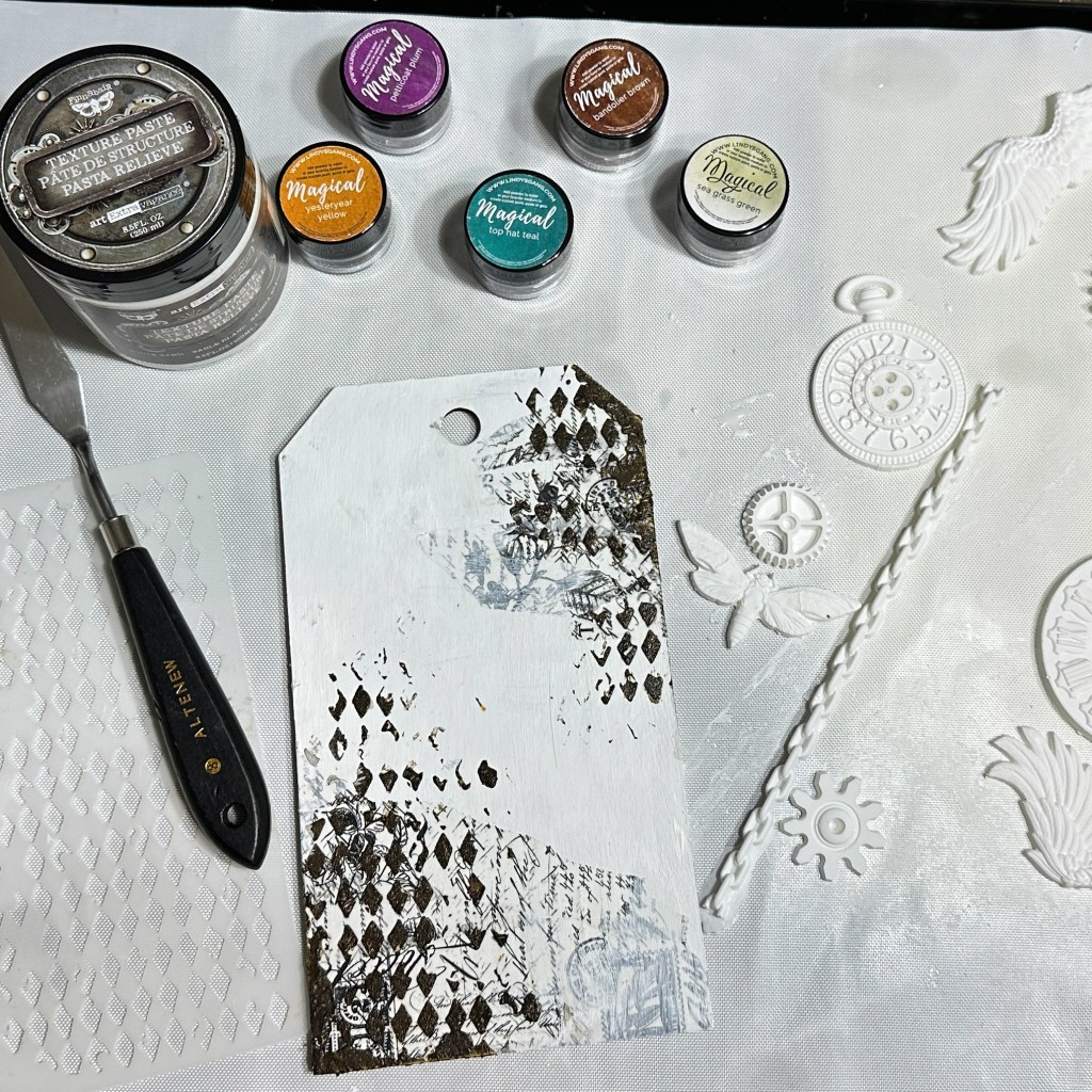 3. I added texture and color to the background using stamps, a stencil, and Lindy’s magical powders. I used the following Magical colors: Yesteryear Yellow, Petticoat Plum, Top Hat Teal, and Bandolier Brown. I mixed texture paste with Bandolier Brown to create my own brown paste. Using a palette knife, I used it through a Stamperia stencil, Around The World Double Texture in random places over the washi tape. I added the texture paste directly to the upper right and lower left sides of the tag. Let the paste dry.